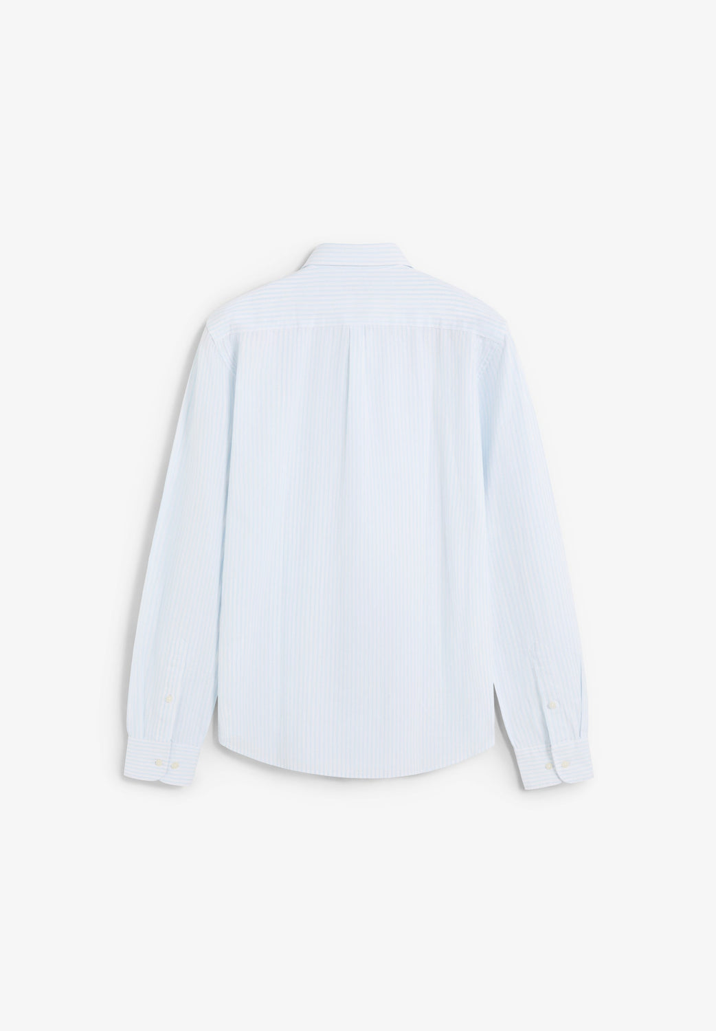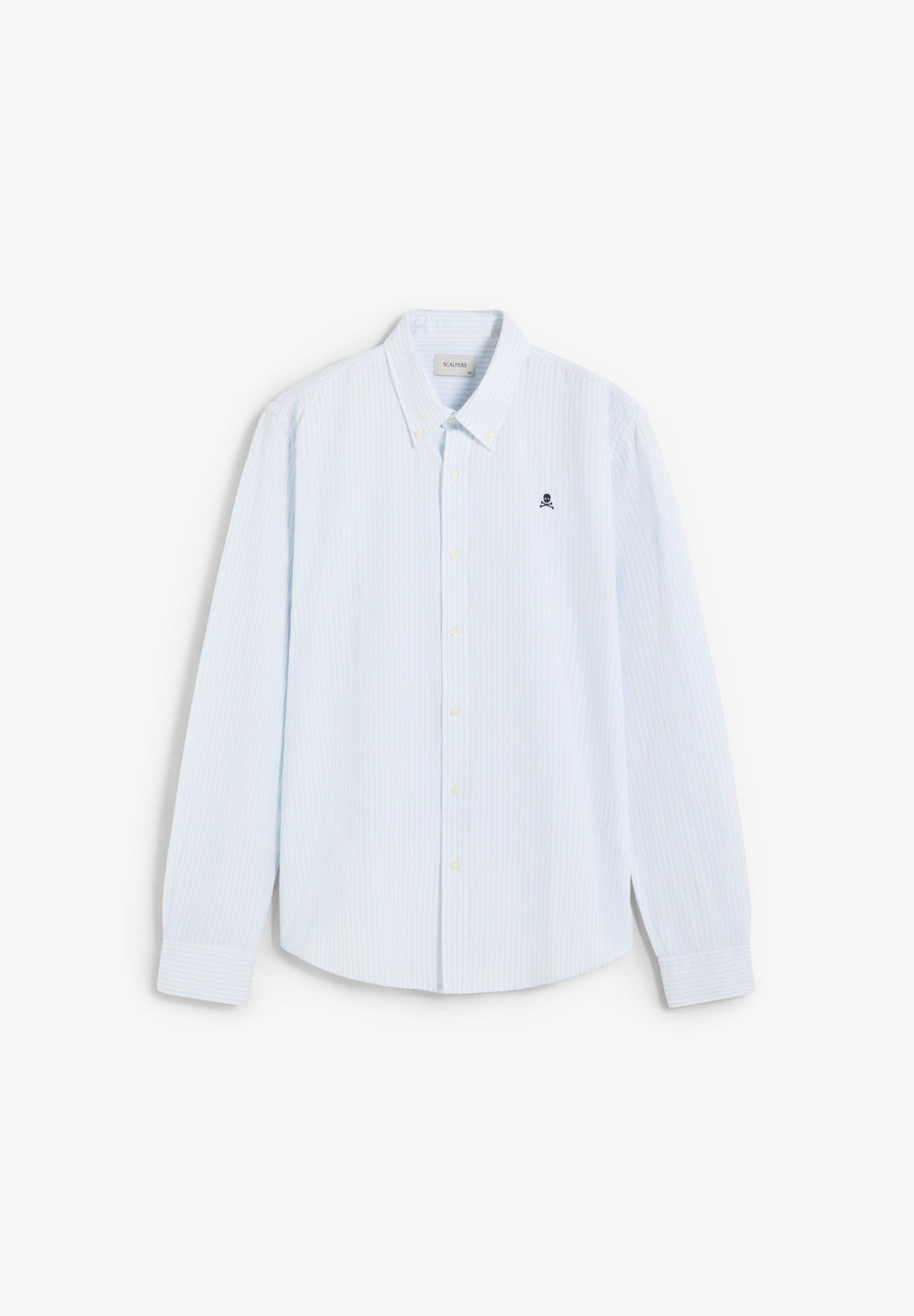 Camisa Oxford confecionada em mistura de algodão e linho. Padrão às riscas. Fecho frontal com botões. Skull bordada a contrastar no peito.