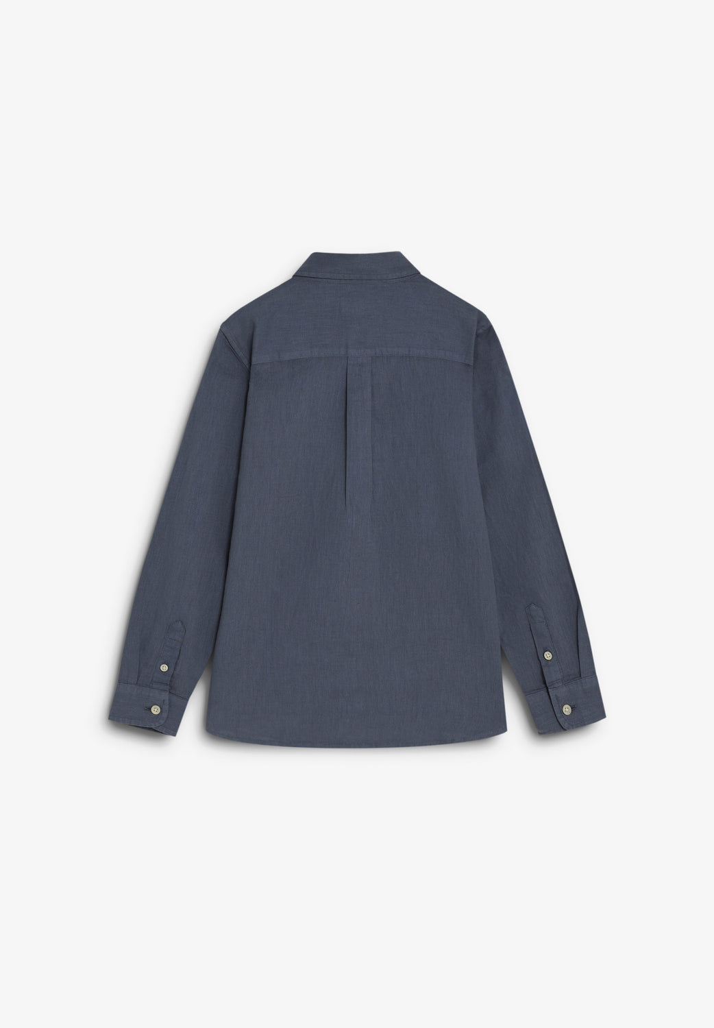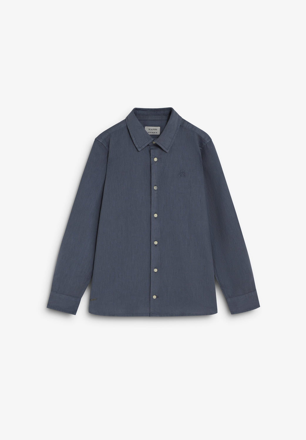 Confecionada em mistura de algodão BCI e linho. Colarinho clássico e fecho frontal de botões. Bordado de skull no peito no tom. Punhos com botões e corte regular fit. Pormenor de logótipo na parte inferior em chapa metálica.