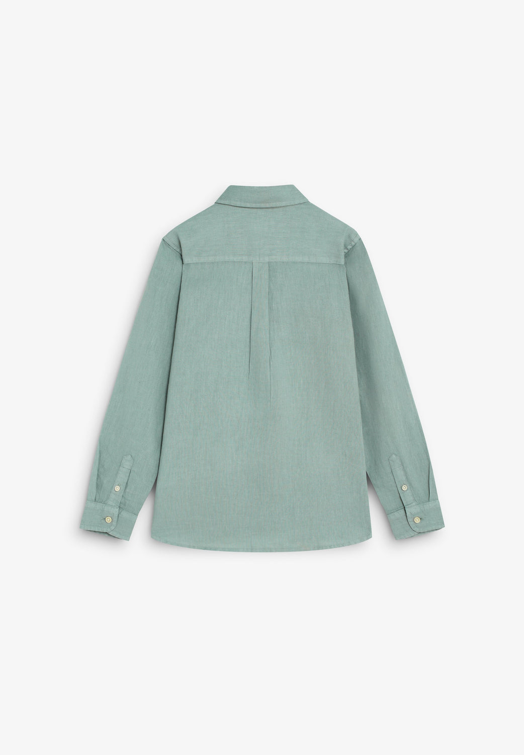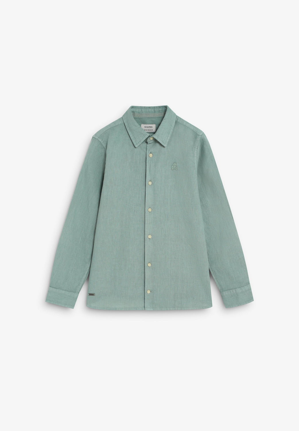 Confecionada em mistura de algodão BCI e linho. Colarinho clássico e fecho frontal de botões. Bordado de skull no peito no tom. Punhos com botões e corte regular fit. Pormenor de logótipo na parte inferior em chapa metálica.