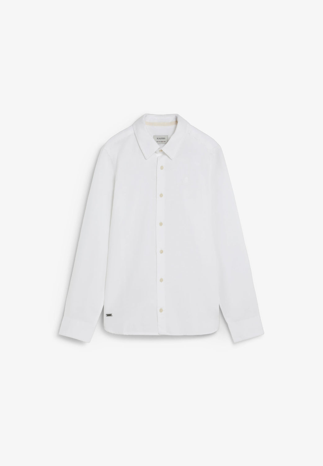 Confecionada em mistura de algodão BCI e linho. Colarinho clássico e fecho frontal de botões. Bordado de skull no peito no tom. Punhos com botões e corte regular fit. Pormenor de logótipo na parte inferior em chapa metálica.