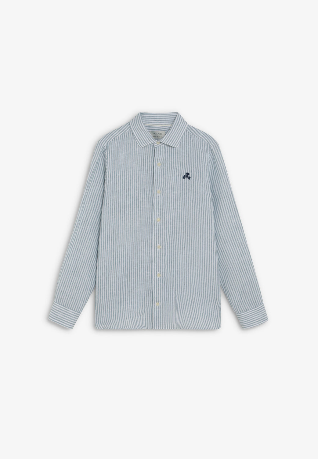 Camisa confecionada em 100% linho. Regular fit. Colarinho clássico e manga comprida com botão no punho. Padrão às riscas. Fecho com botões à frente. Pormenor de skull bordada no peito.