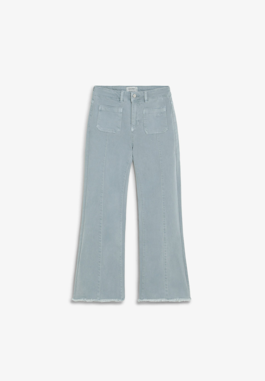 Calças à boca de sino confecionadas em algodão. Fecho frontal com botão e zip. Presilhas na cintura. Bolsos tipo remendo à frente e atrás. Perna ligeiramente à boca de sino a partir do joelho. Acabamento com desfiados nas bainhas. Costuras à frente. Pormenor de bordado no tom no bolso frontal esquerdo.