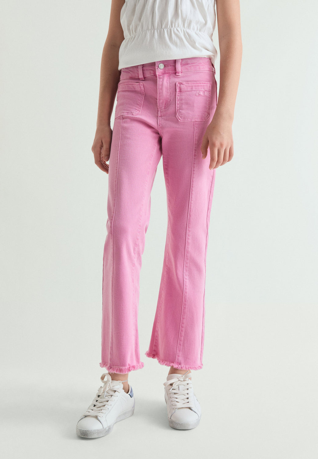Calças à boca de sino confecionadas em algodão. Fecho frontal com botão e zip. Presilhas na cintura. Bolsos tipo remendo à frente e atrás. Perna ligeiramente à boca de sino a partir do joelho. Acabamento com desfiados nas bainhas. Costuras à frente. Pormenor de bordado no tom no bolso frontal esquerdo.