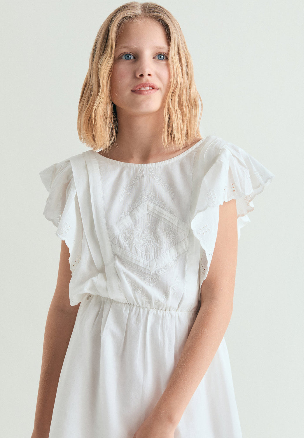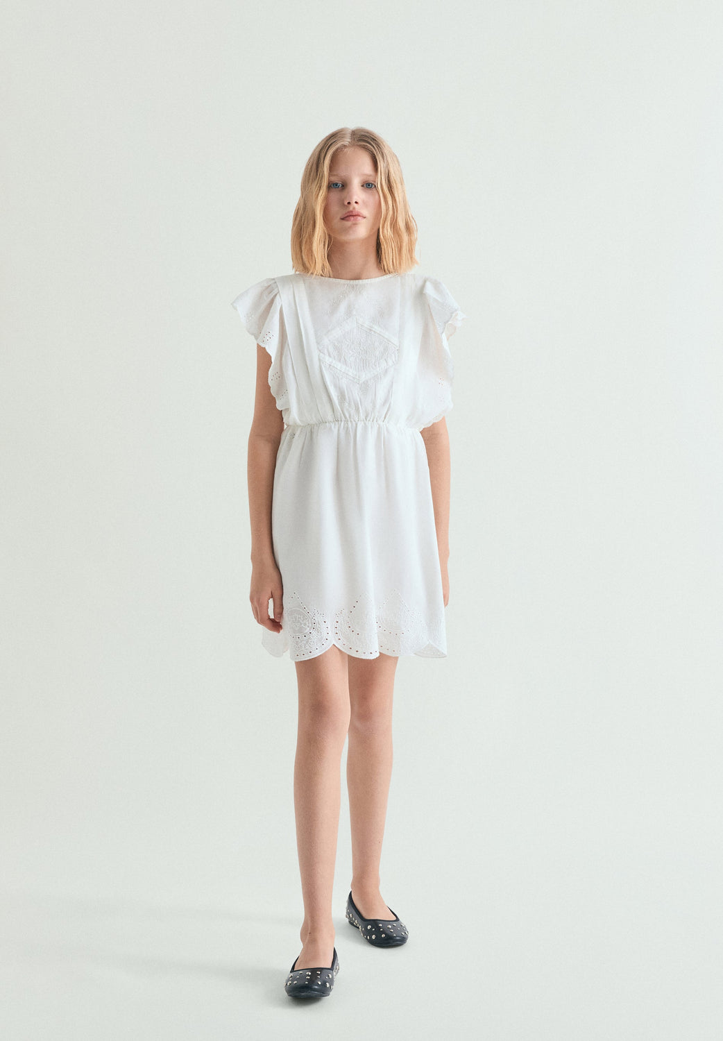 Vestido mini confecionado em 100% algodão BCI. Relaxed fit. Decote redondo e manga cava com folhos. Detalhes à frente e atrás com favos de mel. Cós elástico. Detalhes perfurados nas mangas e na bainha.