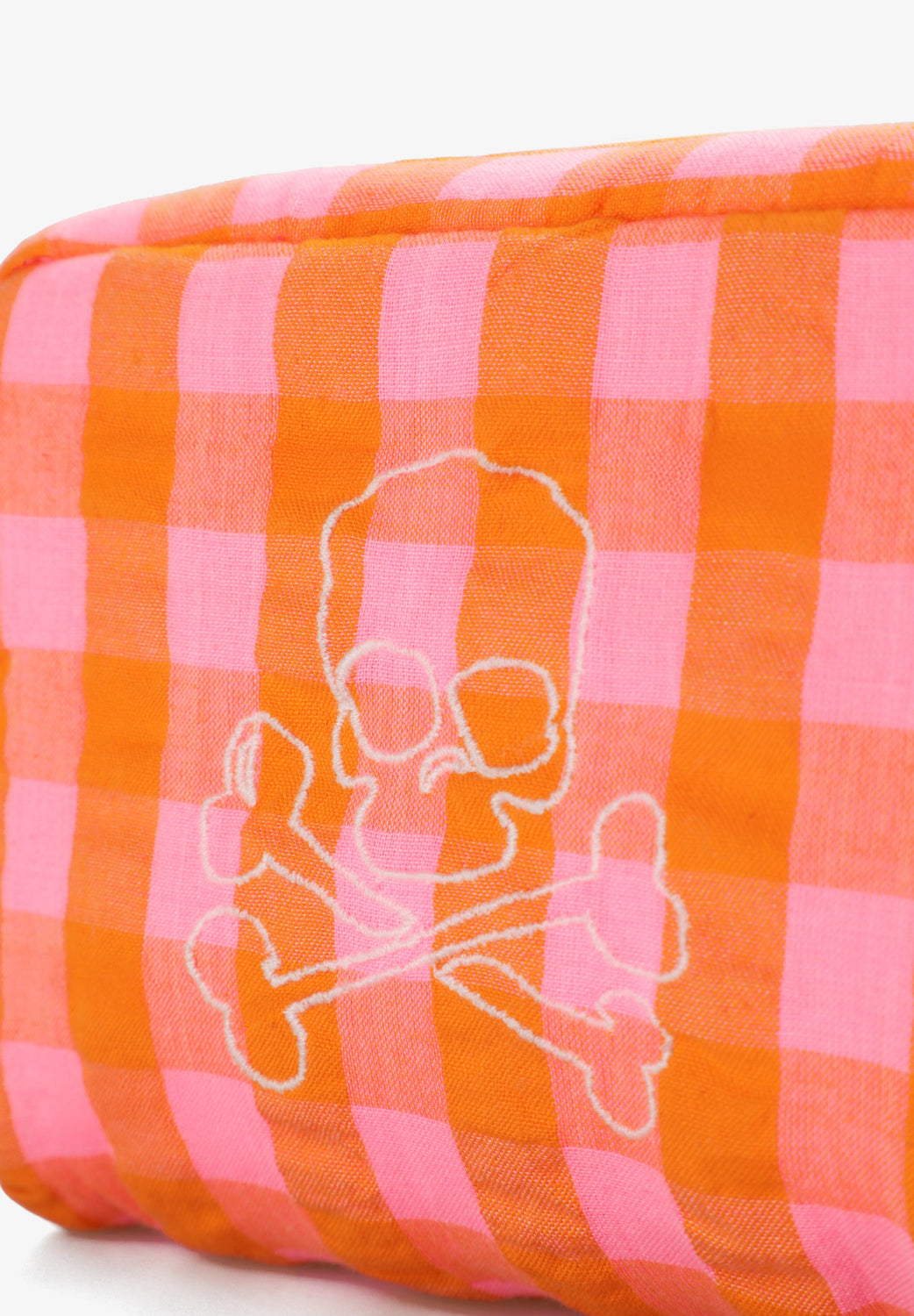 Nécessaire confecionada em 100% algodão BCI. Padrão Vichy. Fecho de correr. Alça lateral. Bordado skull. Pormenor de etiqueta interior.