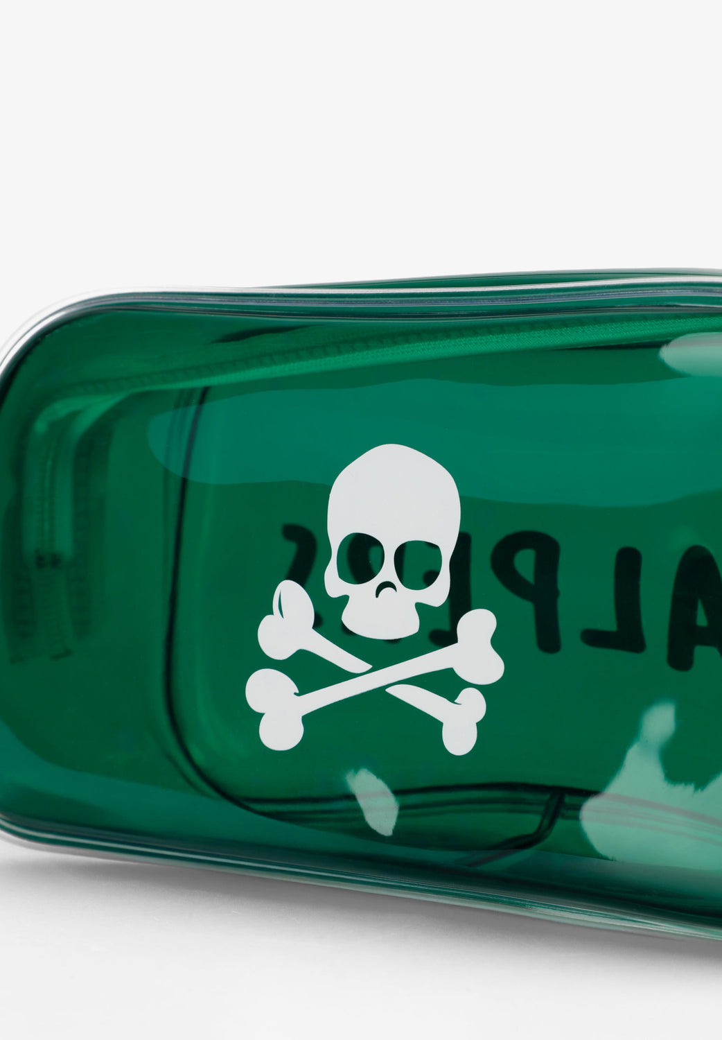 Nécessaire transparente com fecho de correr. Padrão lateral com skull e logótipo. Com frascos transparentes para líquidos.