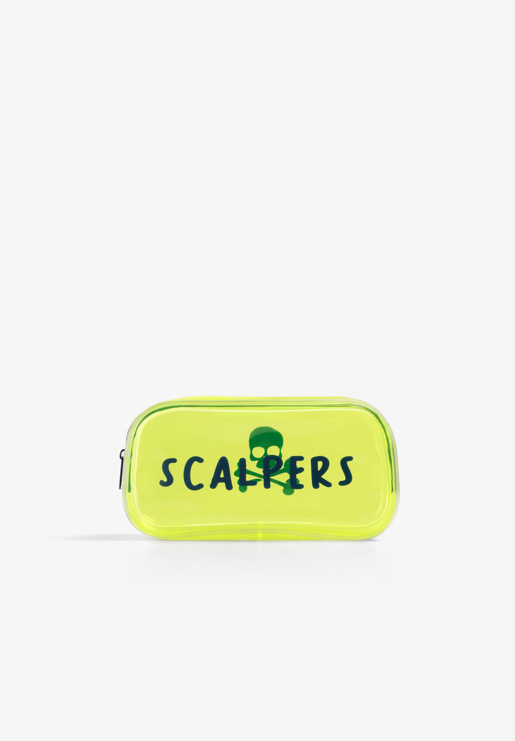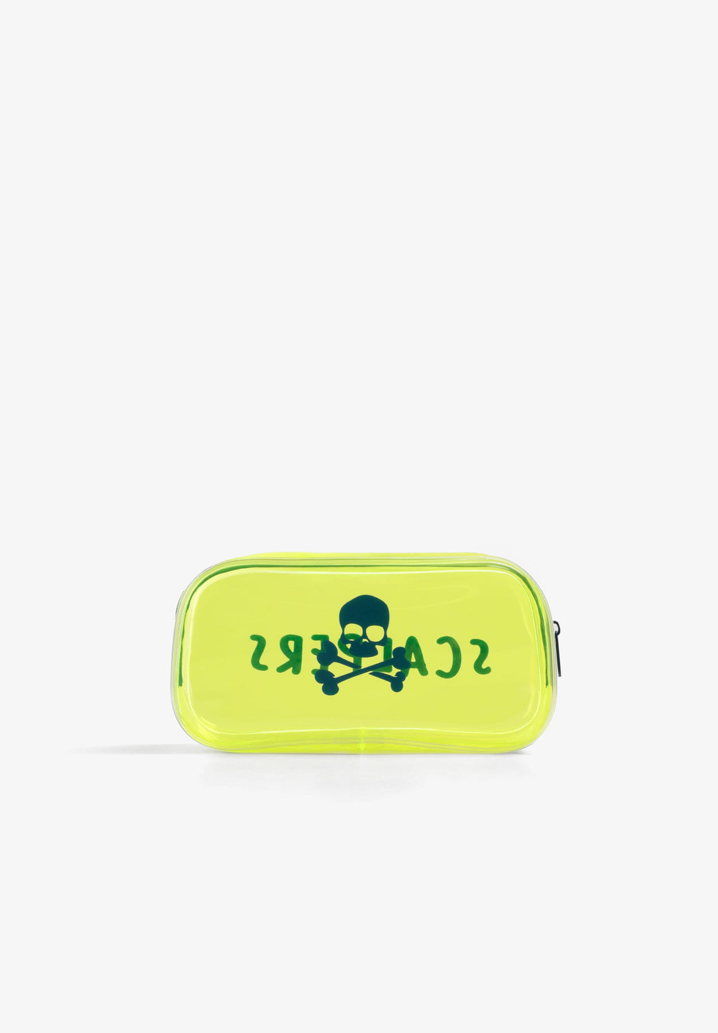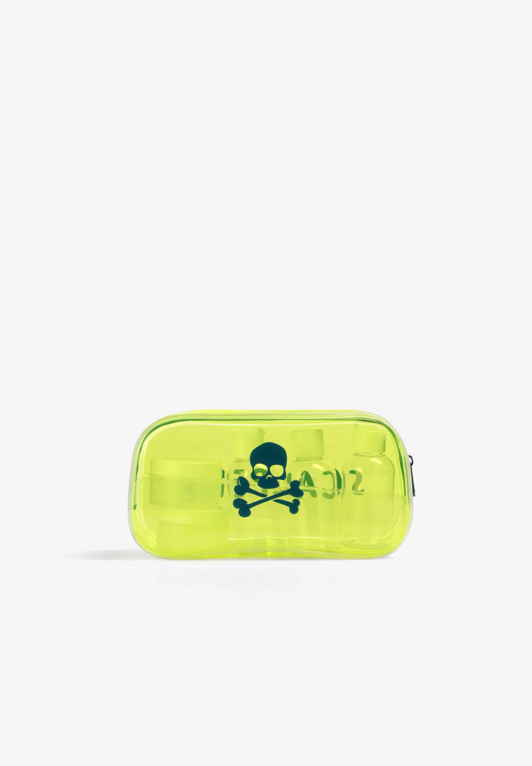 Nécessaire transparente com fecho de correr. Padrão lateral com skull e logótipo. Com frascos transparentes para líquidos.