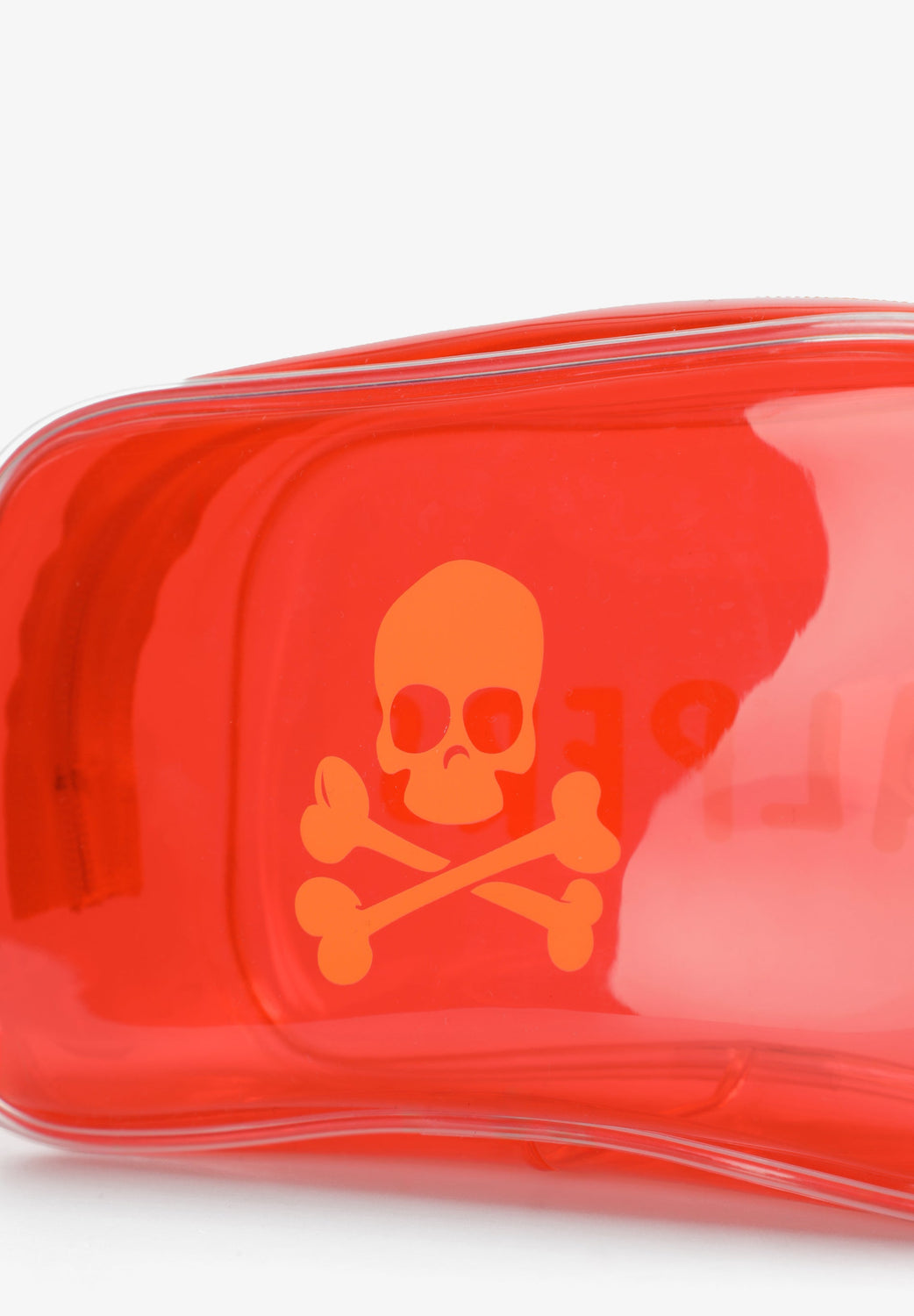 Nécessaire transparente com fecho de correr. Padrão lateral com skull e logótipo. Com frascos transparentes para líquidos.