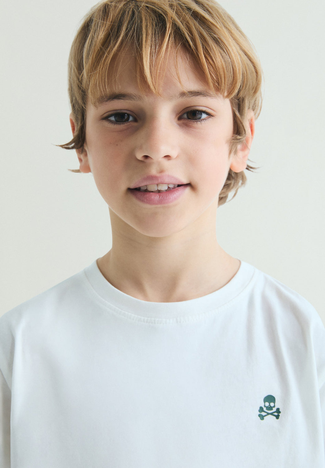 T-shirt confecionada em 100% algodão BCI. Regular fit. Decote redondo e manga curta. Padrão traseiro e skull bordada no peito.
