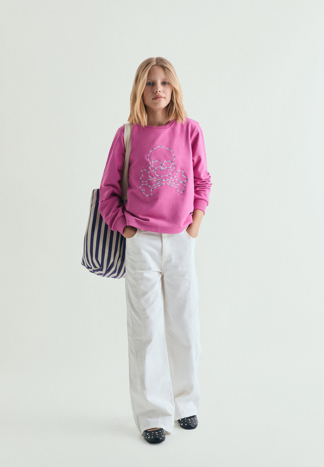 Sweatshirt confecionada em 100% algodão BCI. Skull bordada à frente. Pormenor de logótipo bordado atrás. Acabamentos canelados.