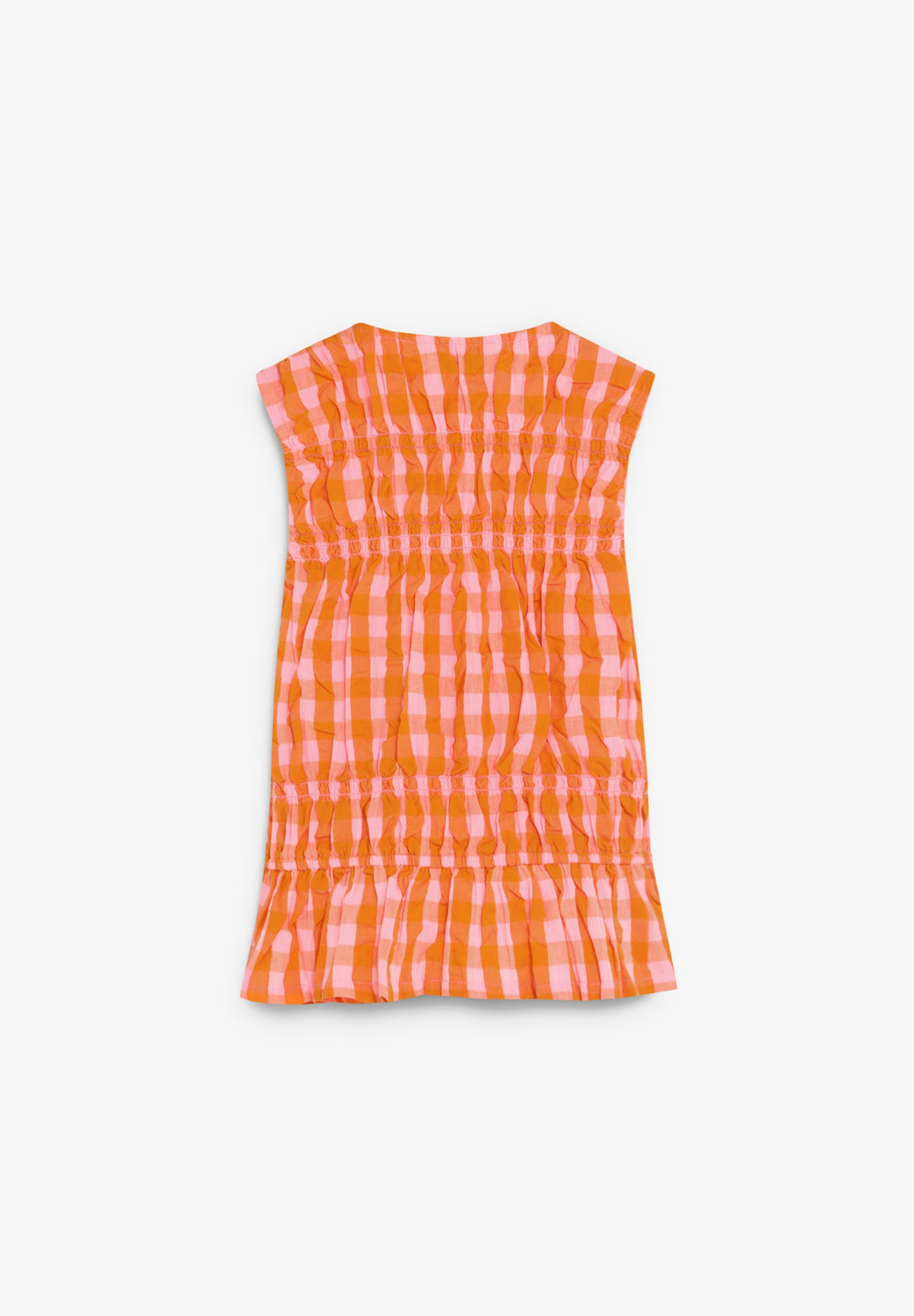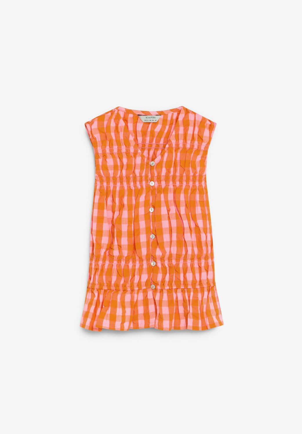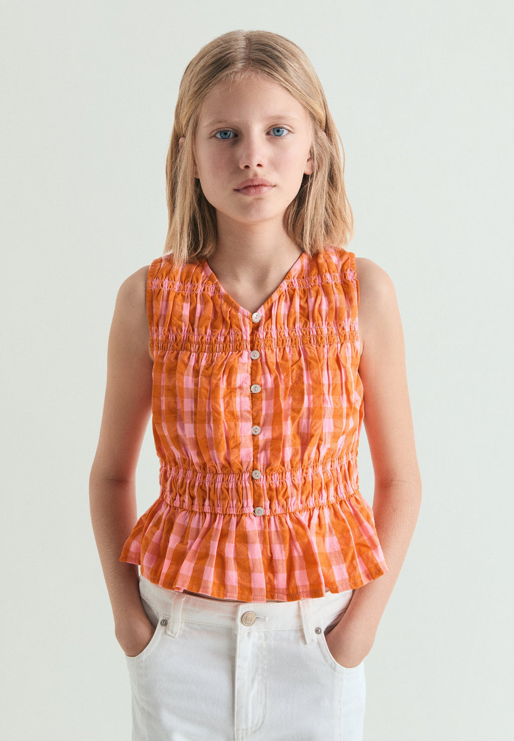 Top confecionado em 100% algodão. Padrão vichy. Regular fit. Decote em V e manga cava. Fecho com botões à frente. Pormenor de franzidos.