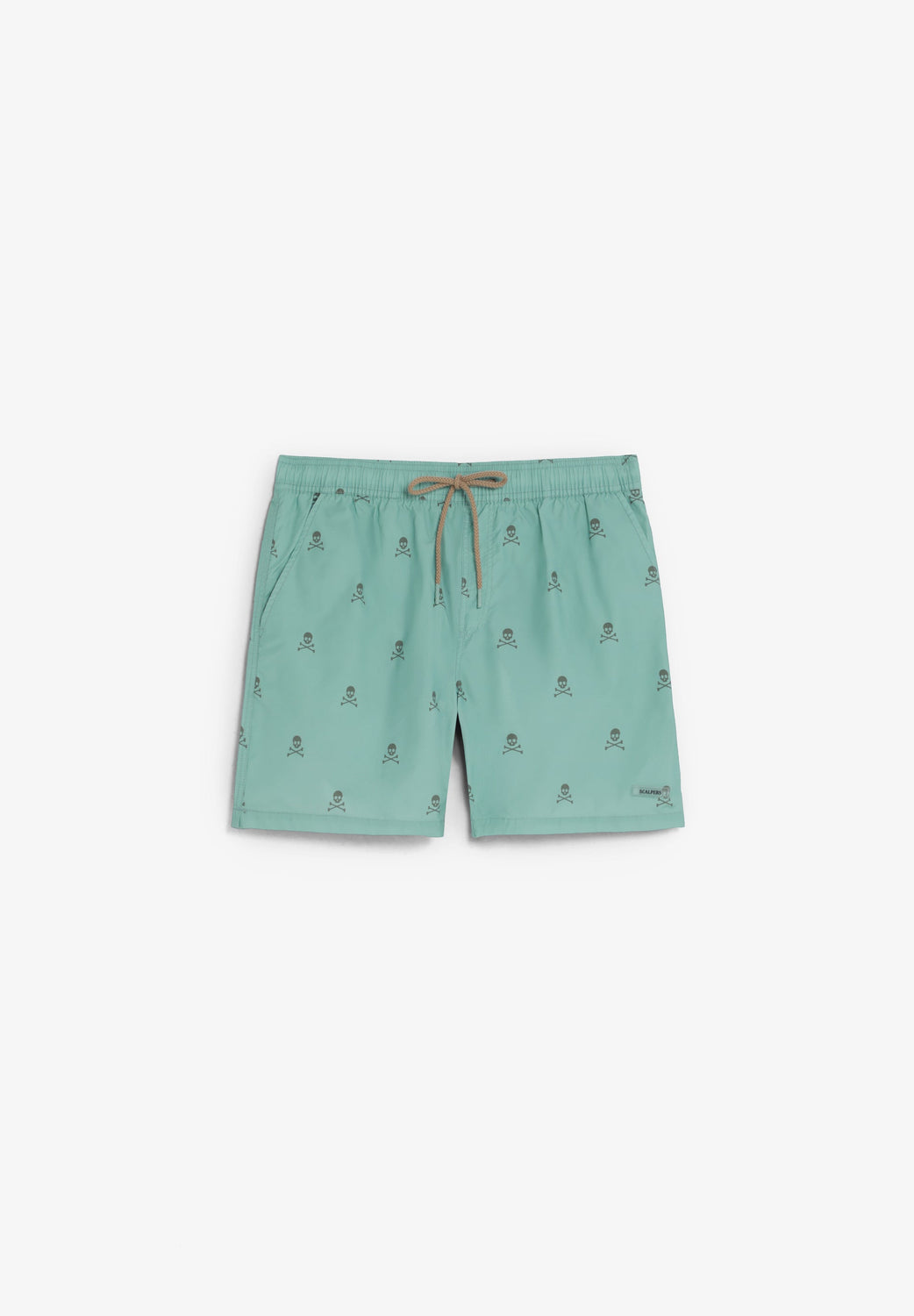 Fato de banho com cós elástico e cordão ajustável. Bolsos laterais. Padrão de skulls em contraste. Bolso traseiro.