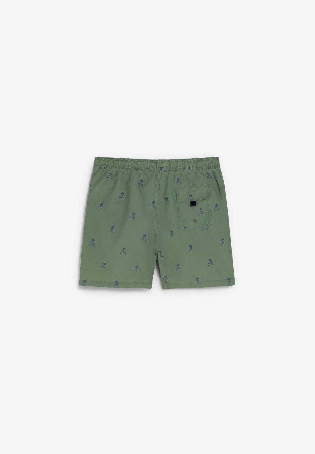 Fato de banho com cós elástico e cordão ajustável. Bolsos laterais. Padrão de skulls em contraste. Bolso traseiro.