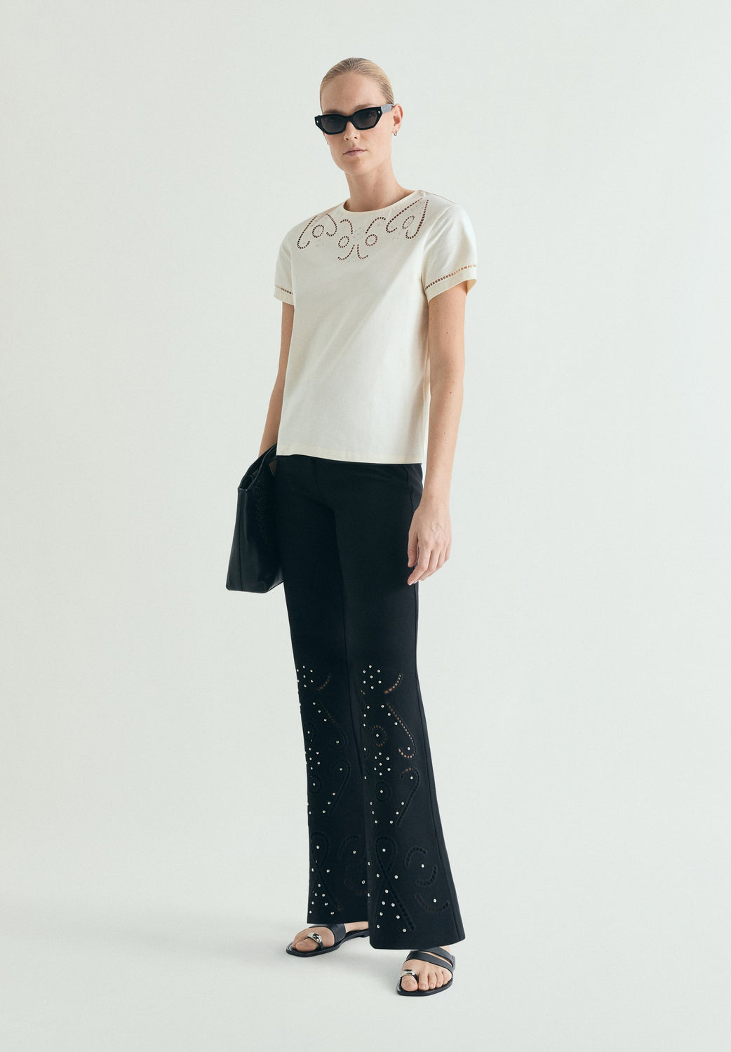 T-shirt confecionada em 100% algodão BCI com pormenores de perfurado à frente e tachas. Corte regular fit, decote redondo e manga curta.