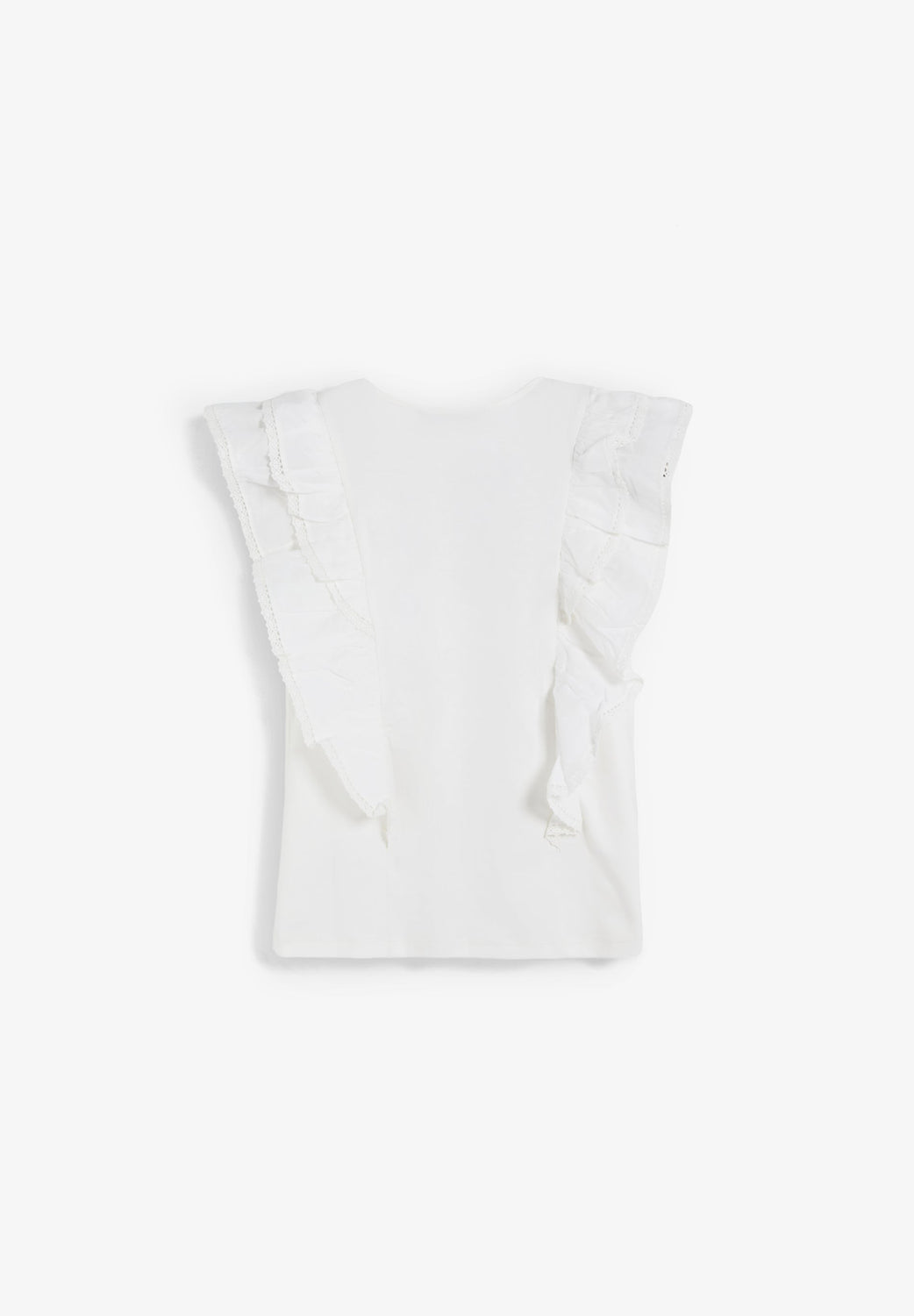 T-shirt confecionada em 100% algodão. Relaxed fit. Decote redondo e manga cava. Folhos com renda decorativa.