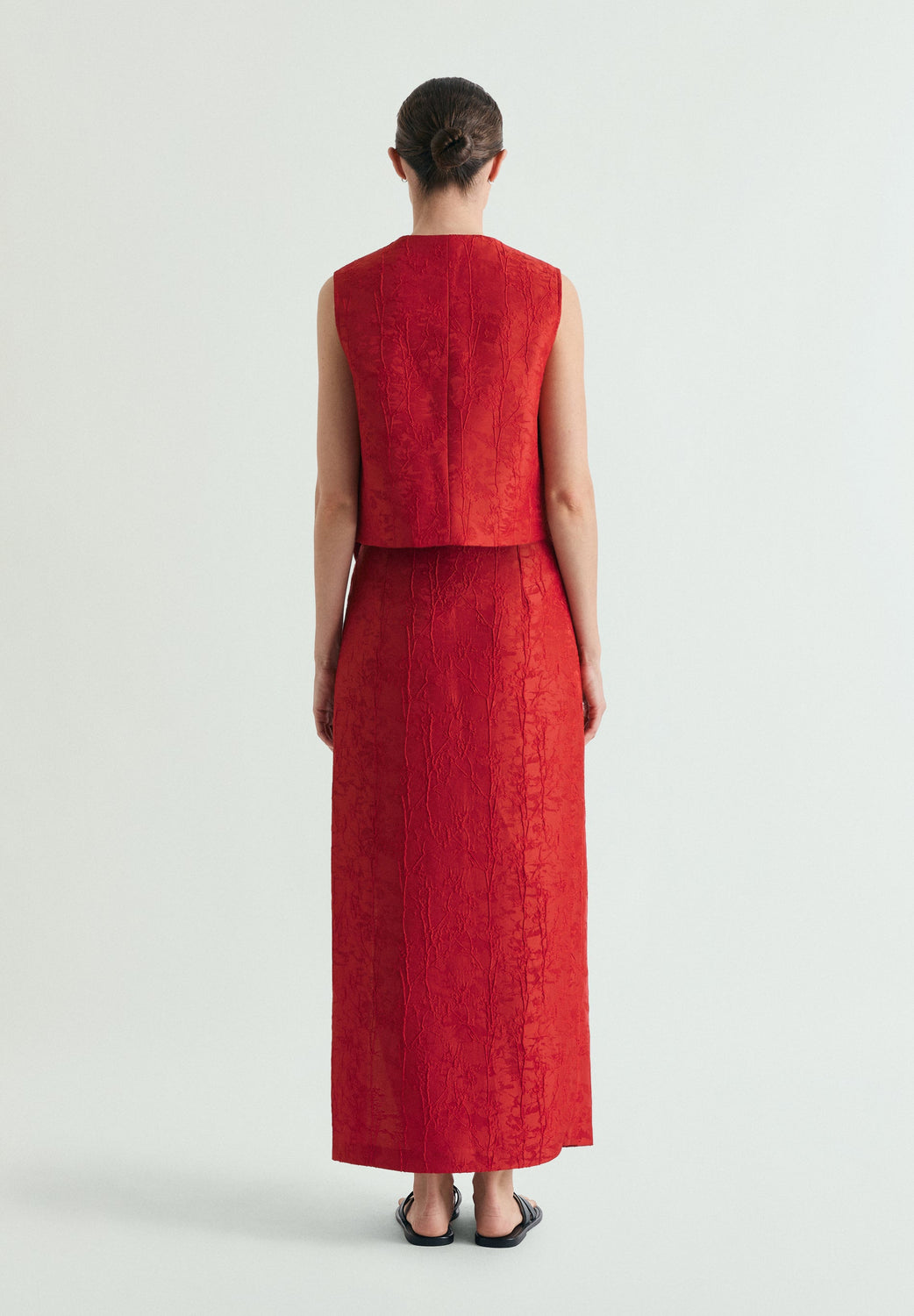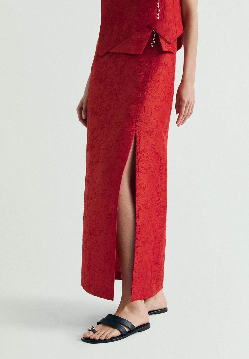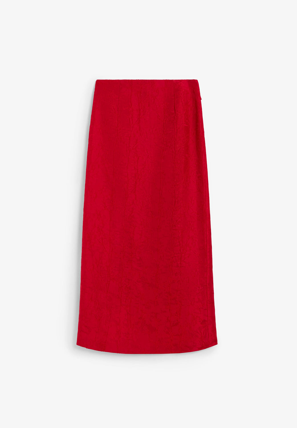 Saia confecionada em tecido acetinado com padrão brocado. Corte regular fit, midi e abertura frontal. Pormenor de prega na cintura com botões e fecho de correr lateral oculto.