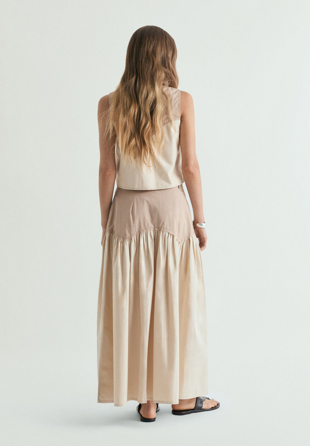 Saia midi confeccionada em dois tecidos em contraste. Slim Fit. Parte superior com presilhas na cintura e fecho de correr e botão. Divisão de tecidos com pormenor de bicos. Bolsos laterais ocultos.