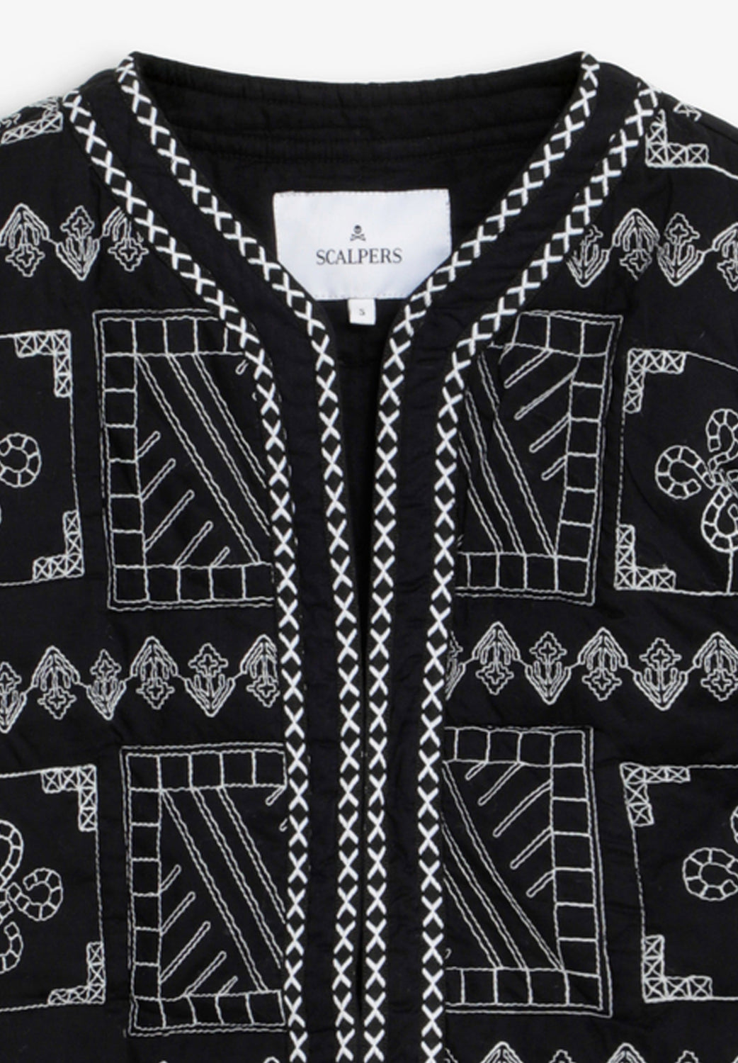 Cardigan acolchoado com bordados geométricos em contraste. Corte direito. Decote em V e manga comprida. Borda decorativa nas extremidades.