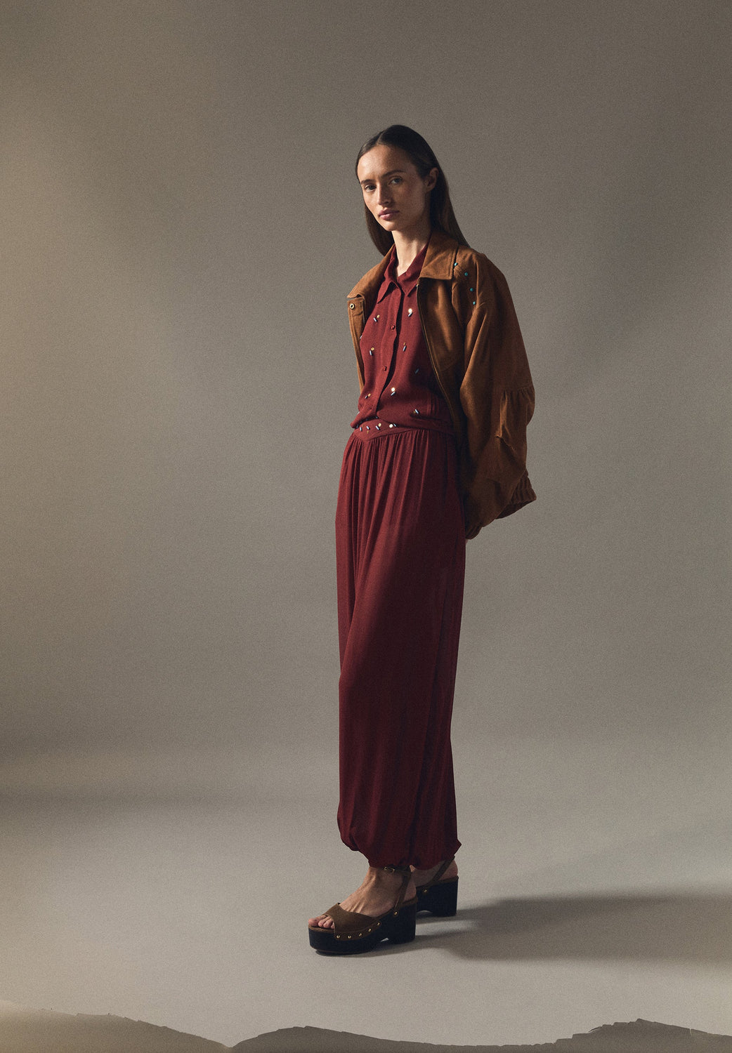 Calças largas confecionadas em tecido fluido com pormenores de apliques na cintura e laços ajustáveis no tornozelo. Corte regular fit, cós elástico traseiro.