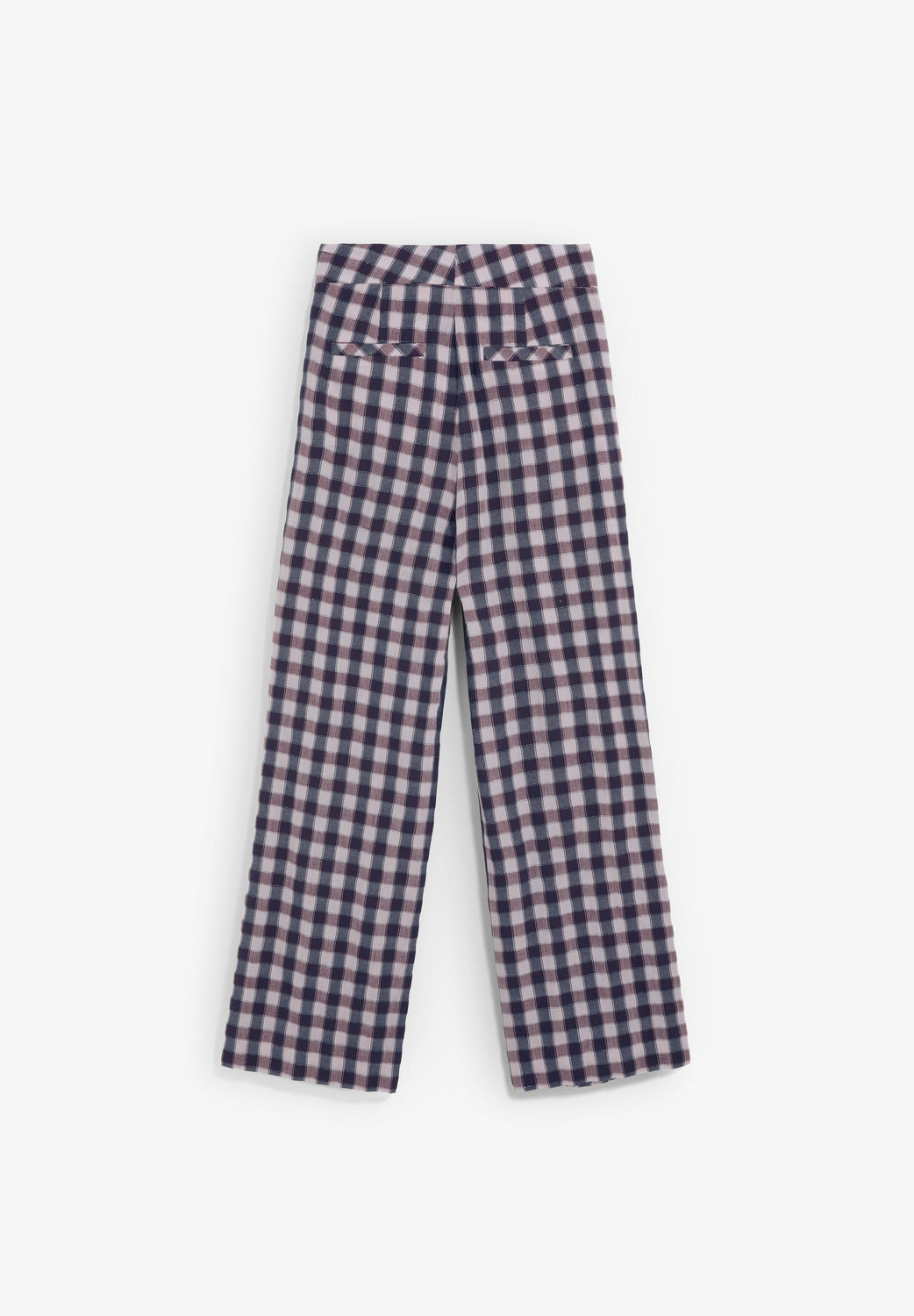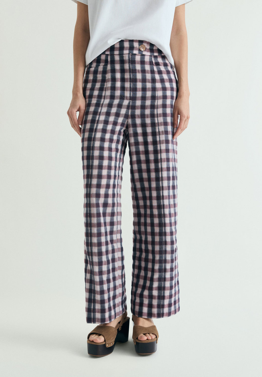 Calças confecionadas em tecido fluido com fio metalizado. Regular fit. Padrão de xadrez vichy. Bolsos laterais e bolsos de casa do botão atrás. Fecho com fecho de correr e botão deslocado.