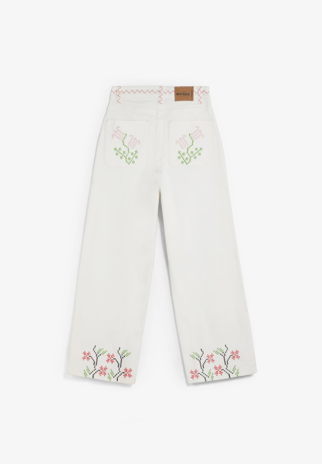 Calças denim confecionadas em algodão ligeiramente elástico. Loose fit, perna larga. Mid waist alta e presilhas na cintura. Pormenores florais bordados multicolor. Fecho de correr e botão à frente.