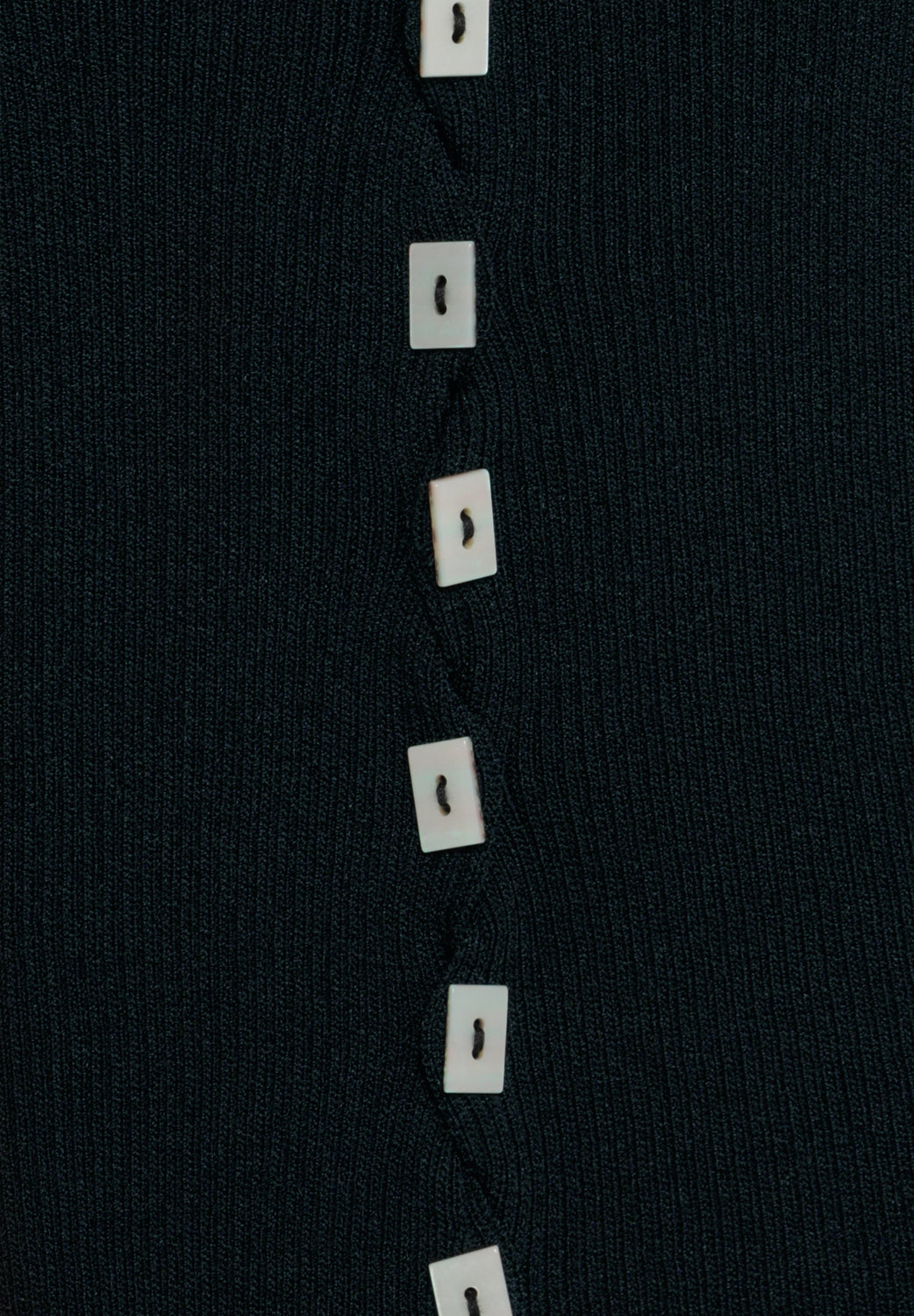 Top assimétrico confecionado em tecido de malha canelada. Decote em bico. Apliques laterais decorativos integrados na costura.