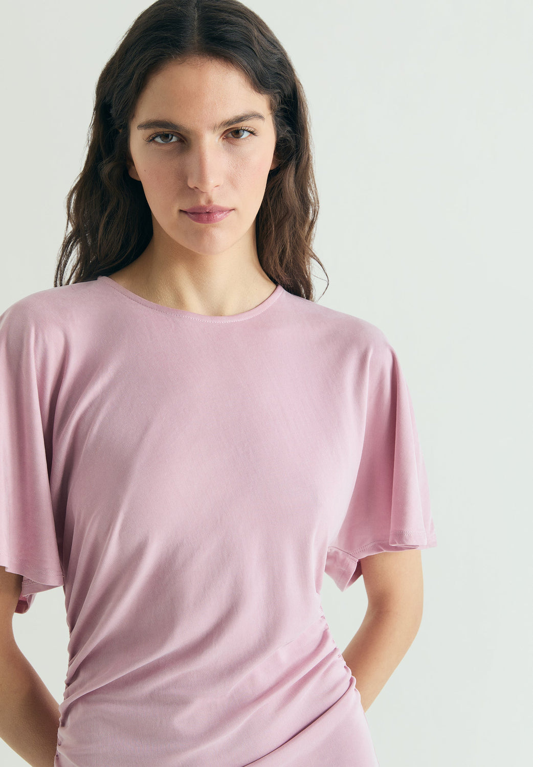 Vestido confecionado em cupro. Corte slim fit, decote redondo e manga curta com folho. Pormenor de franzidos na cintura. Comprimento midi.