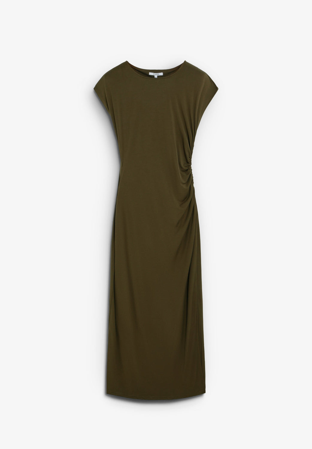 Vestido confecionado em cupro. Corte slim fit, decote redondo e manga curta. Pormenor de franzidos na cintura. Comprimento midi.