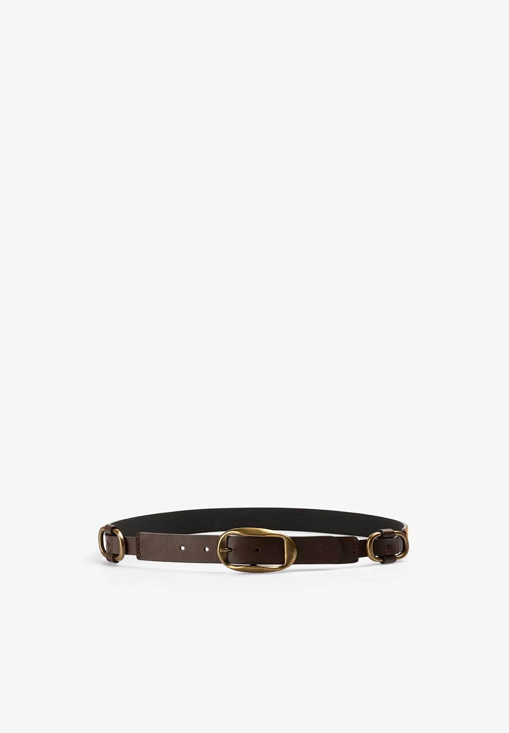 Cinto confecionado em 100% pele com fivela tripla metálica.