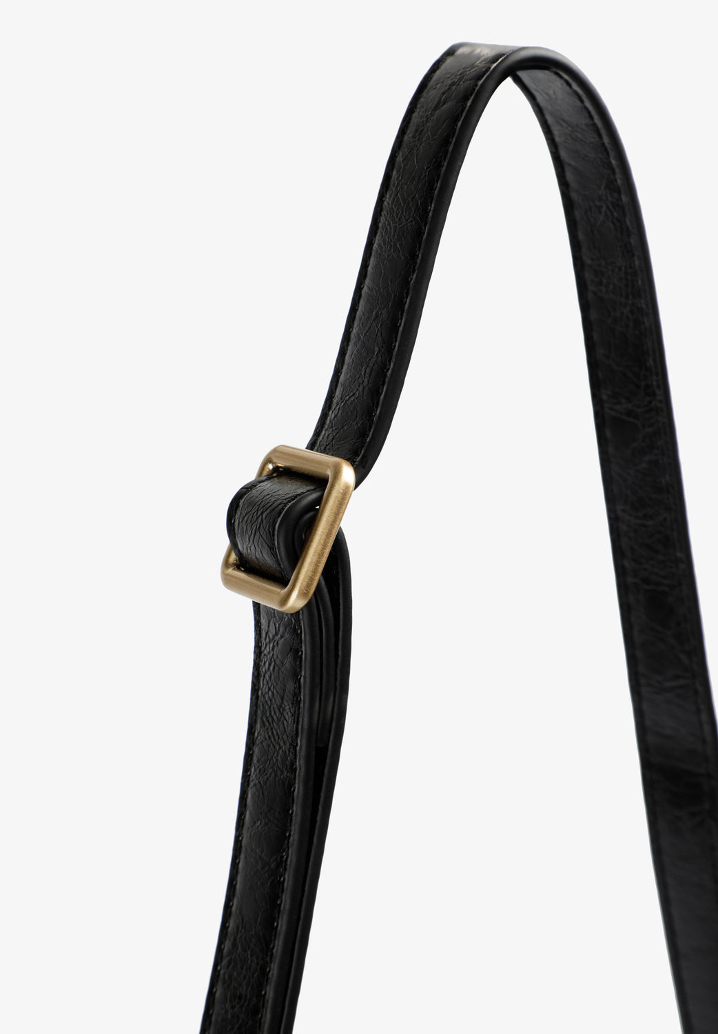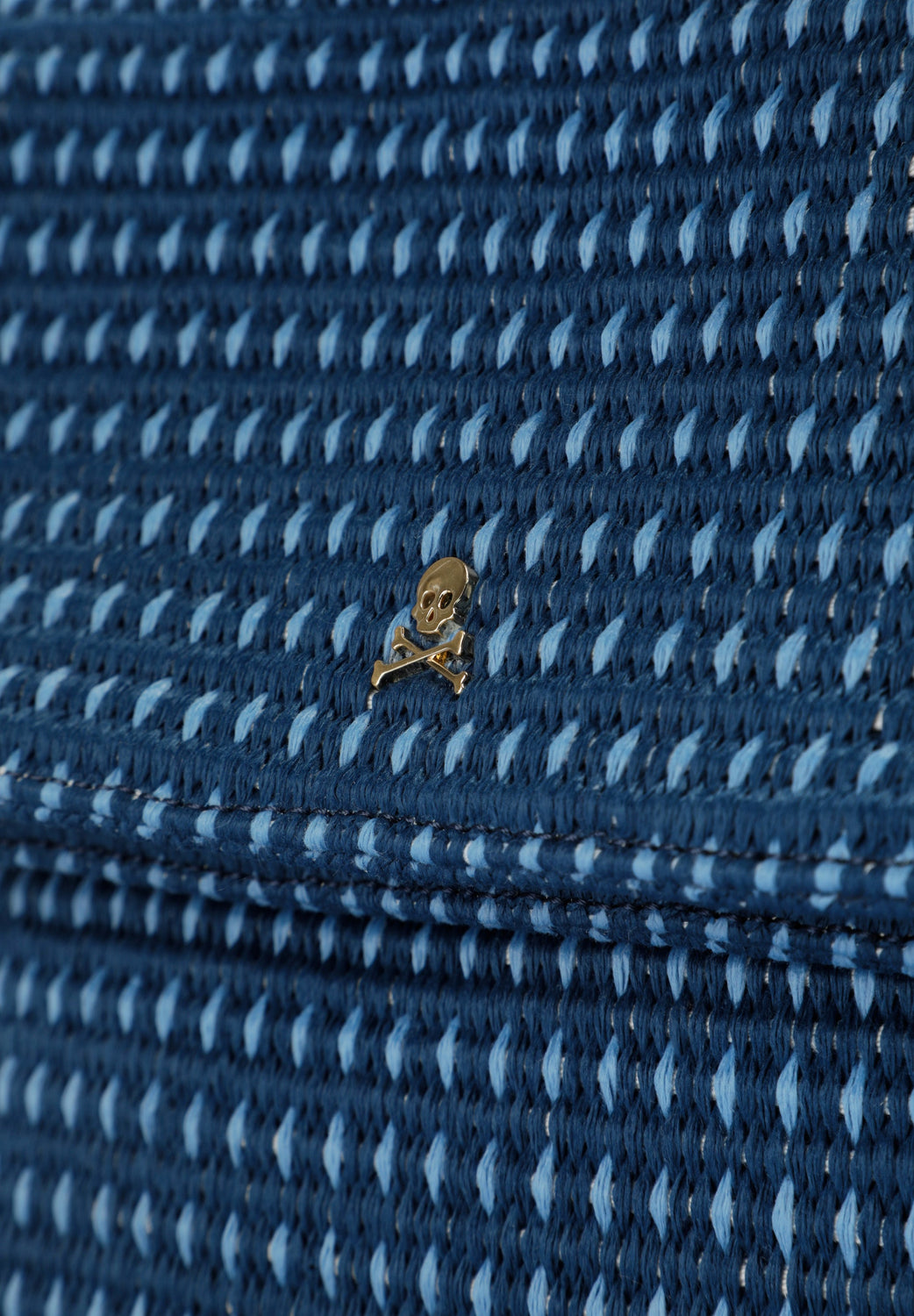 Bolsa estilo clutch confecionada em tecido trançado. Interior forrado. Inclui correia ajustável. Pormenor de skull metálica.