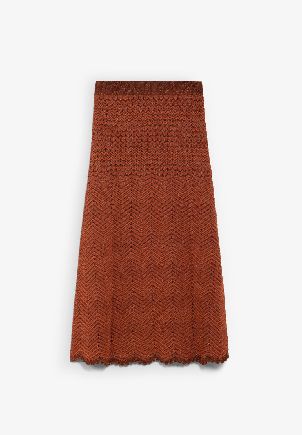 Saia de malha confecionada com fio metalizado. Corte regular fit, comprimento midi e bainha com onda. Cós elástico.