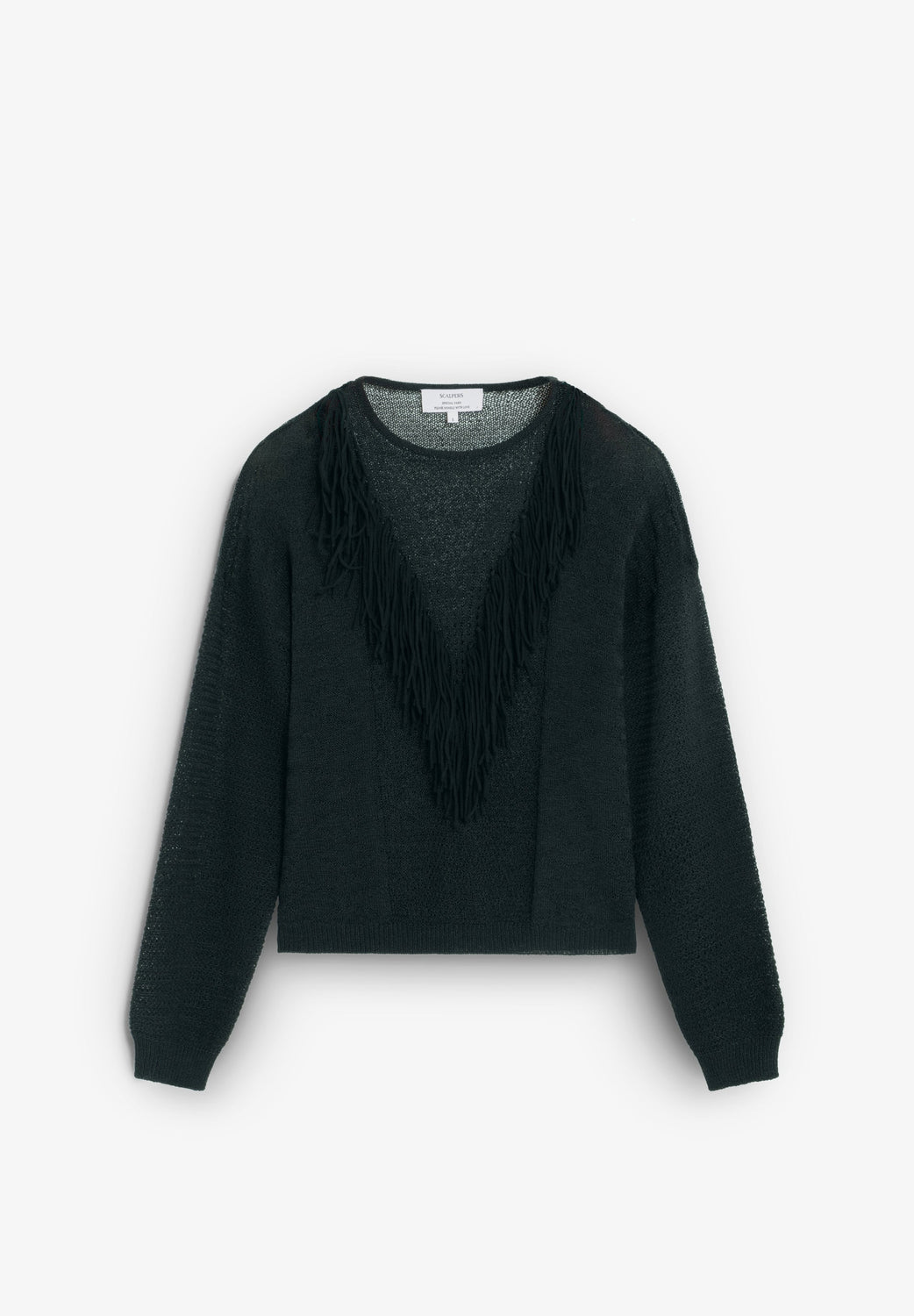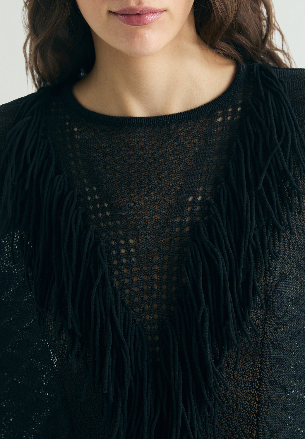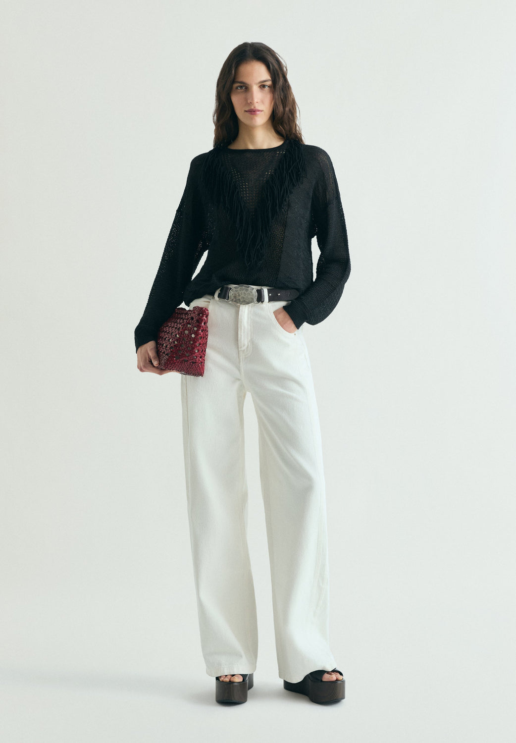 Sweater de malha com estrutura em rendilhado confecionada em mistura de algodão. Pormenor de franjas aplicadas à frente. Com decote redondo e manga comprida. Acabamentos canelados. Pormenor de aplique metálico com skull atrás.