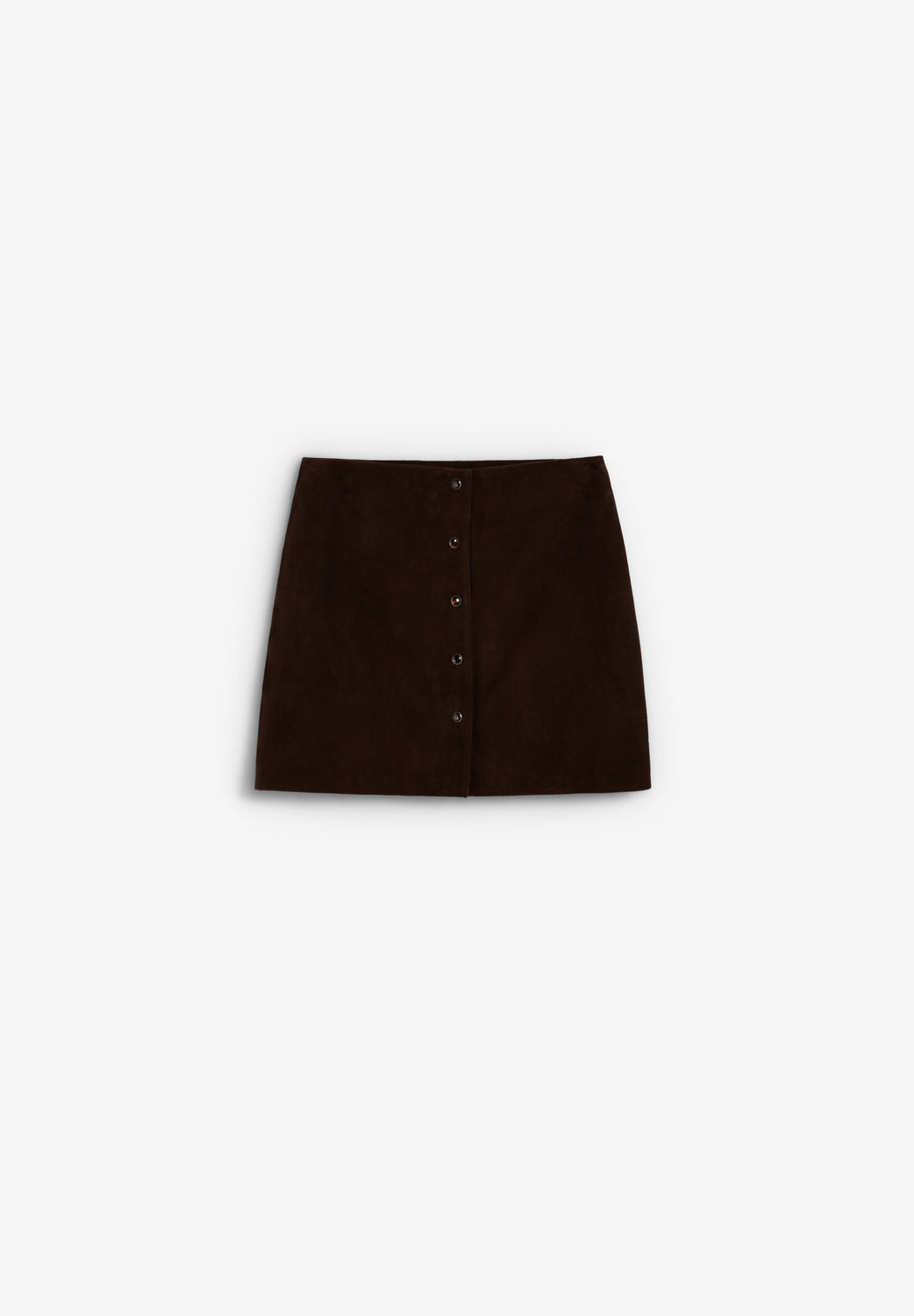 Saia de cort mini em camurça. Fecho com botões à frente.