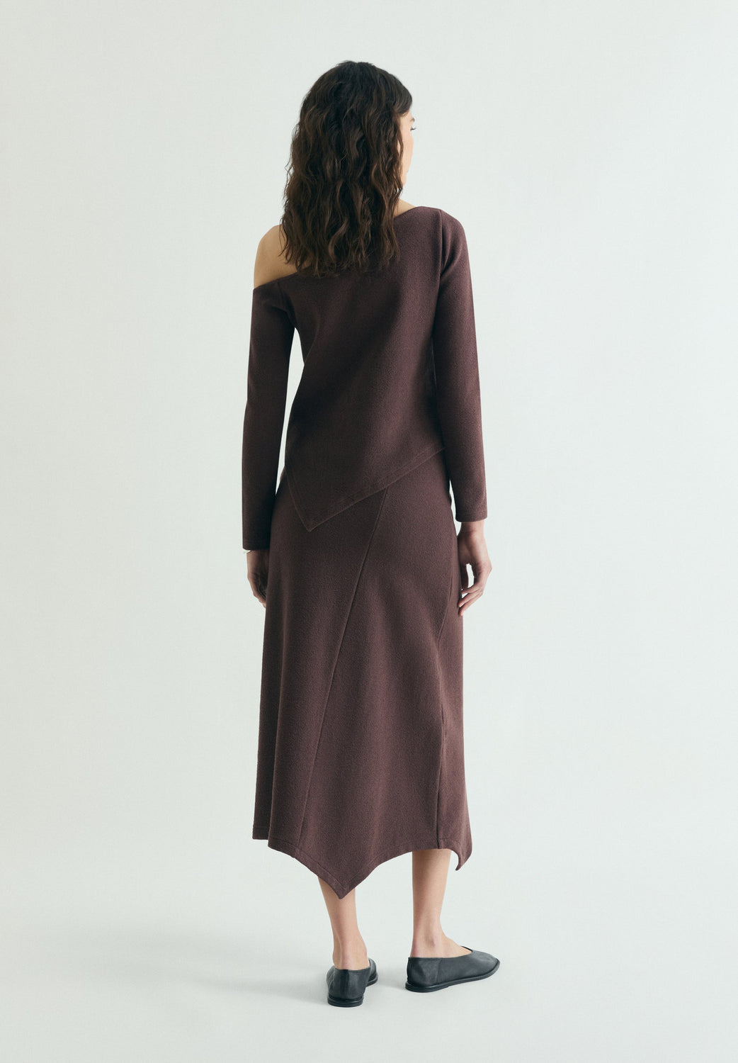 Saia midi de malha volumosa confecionada em 100% algodão. Regular fit, cós elástico e costuras marcadas. Bainha assimétrica.