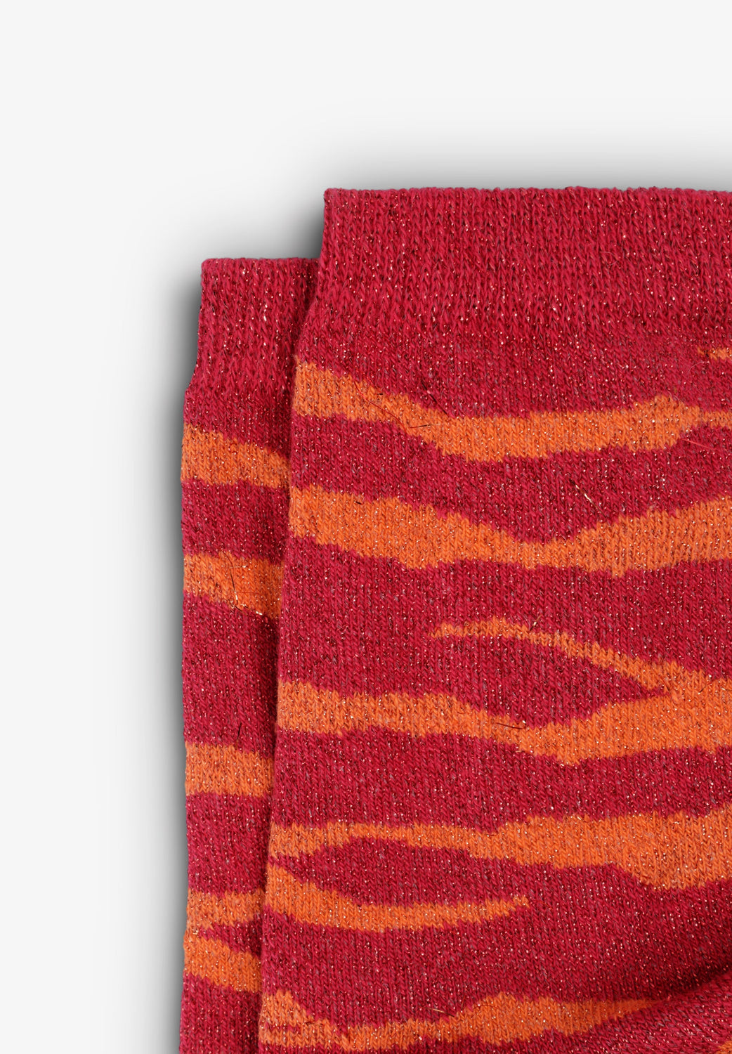 Meias de cano curto com estampado animal. Pormenor de fio metalizado. Pormenor de logótipo na planta do pé.