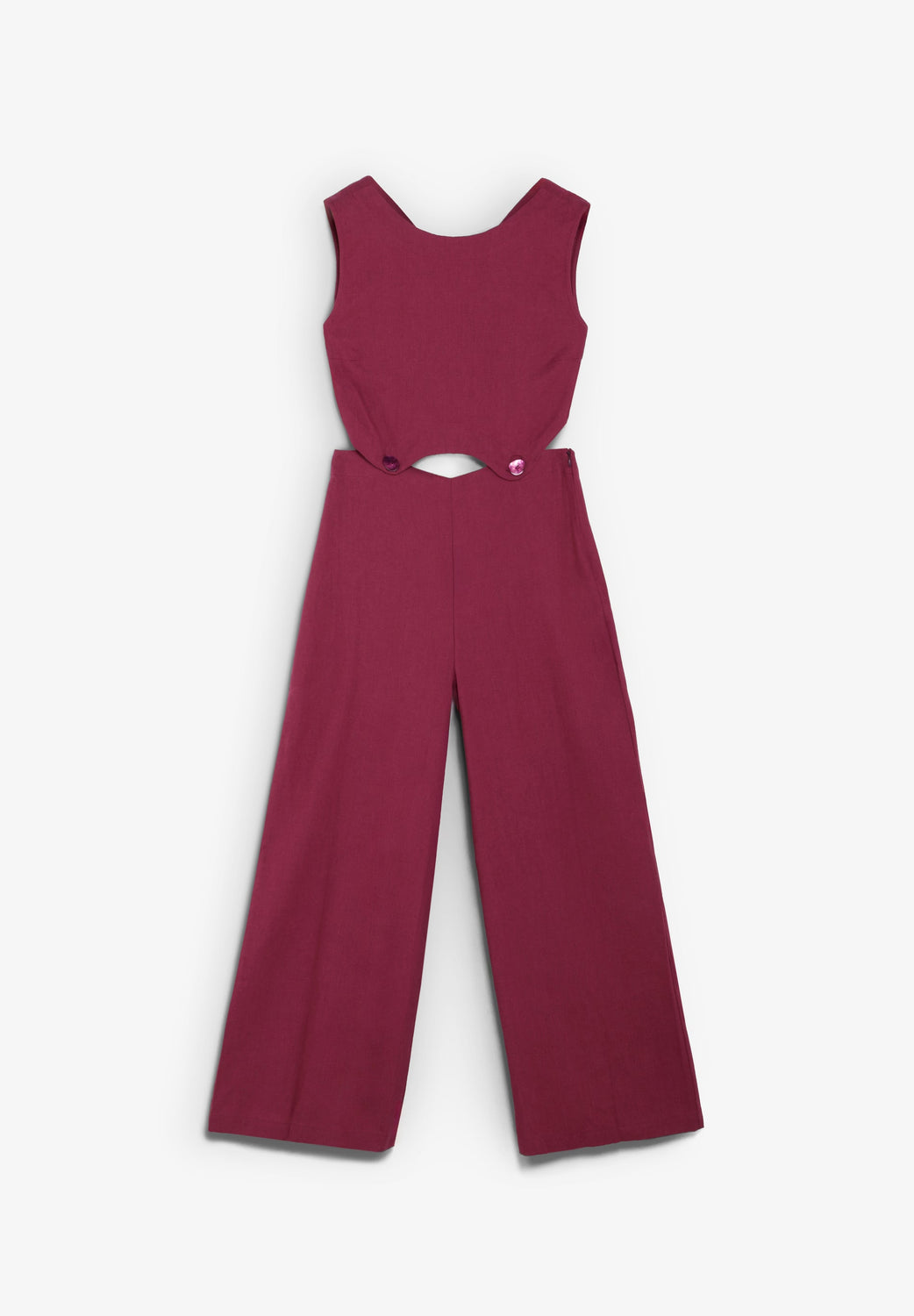 Macacão confecionado em linho. Regular fit. Decote redondo e manga cava. Pormenor das aberturas na cintura integradas nas calças com botões no tom. Costas com decote em V e fecho com botões.