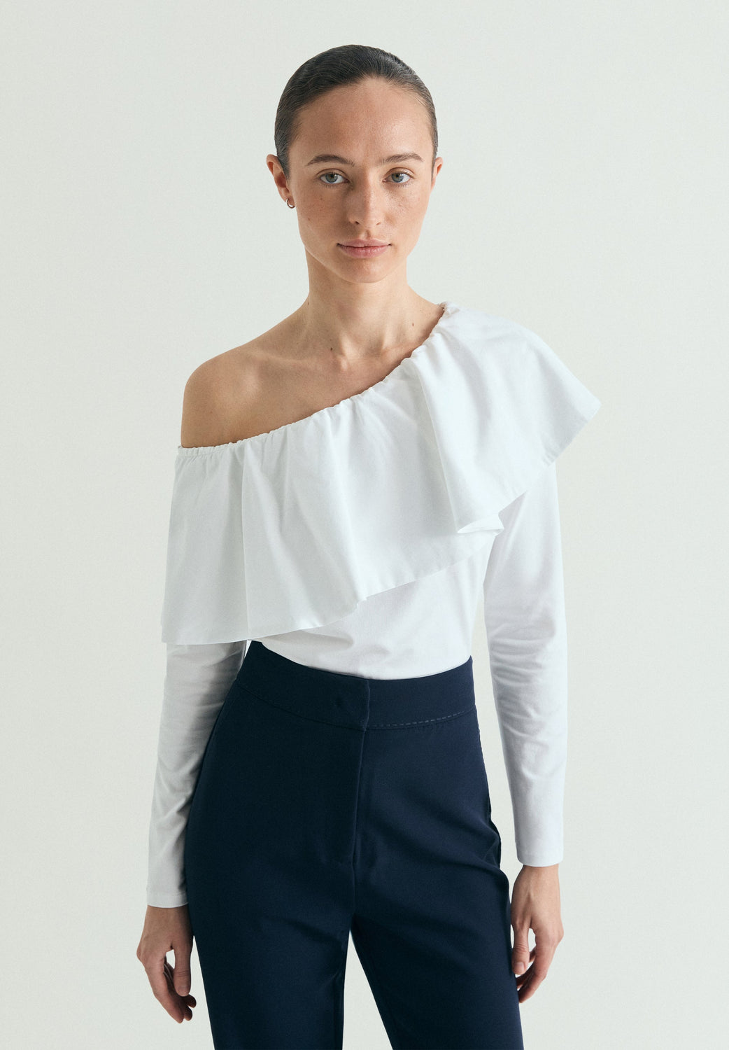 Top confecionado em mistura de algodão. Gola assimétrica com folho e manga comprida.