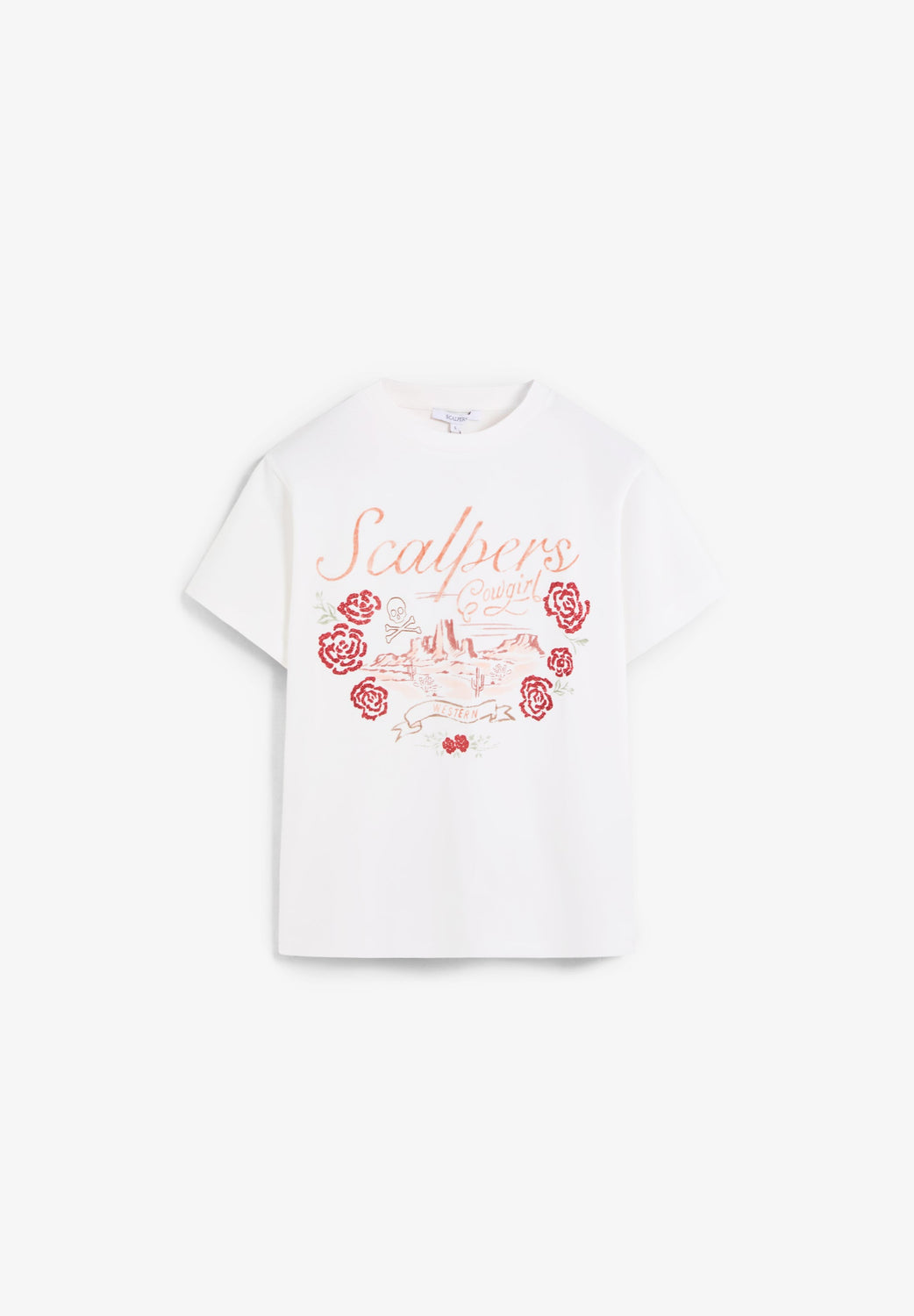 T-shirt confecionada em 100% algodão. Decote redondo e manga curta. Padrão frontal com pormenores em glitter.
