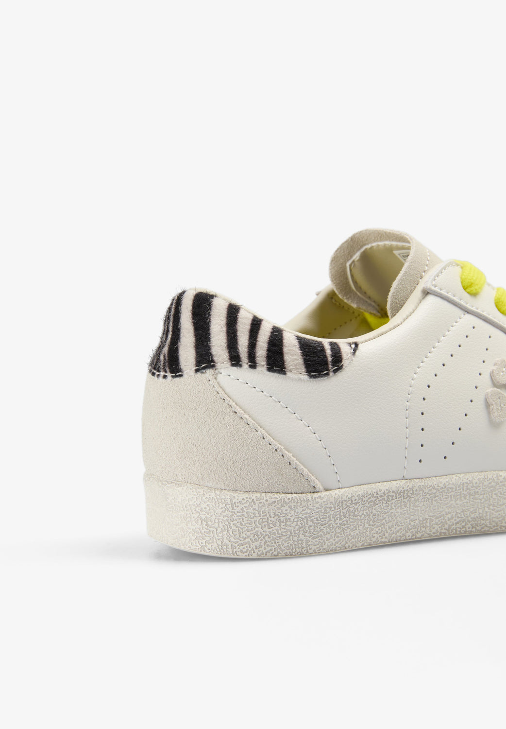 Sapatilhas confecionadas em pele. Acabamento em croute. Logótipo lateral. Calcanhar com estampado animal em padrão. Língua com logótipo. Fecho com cordões flúor.
