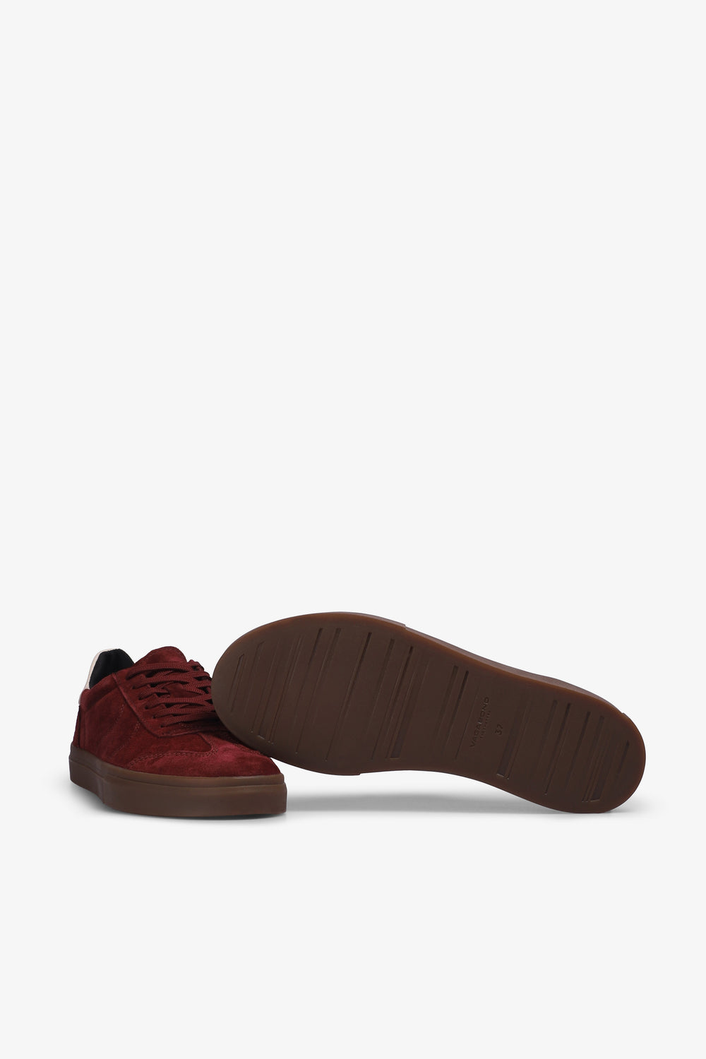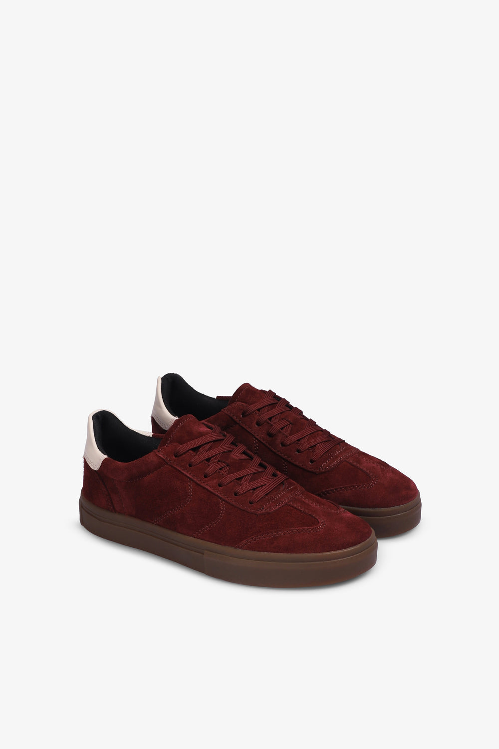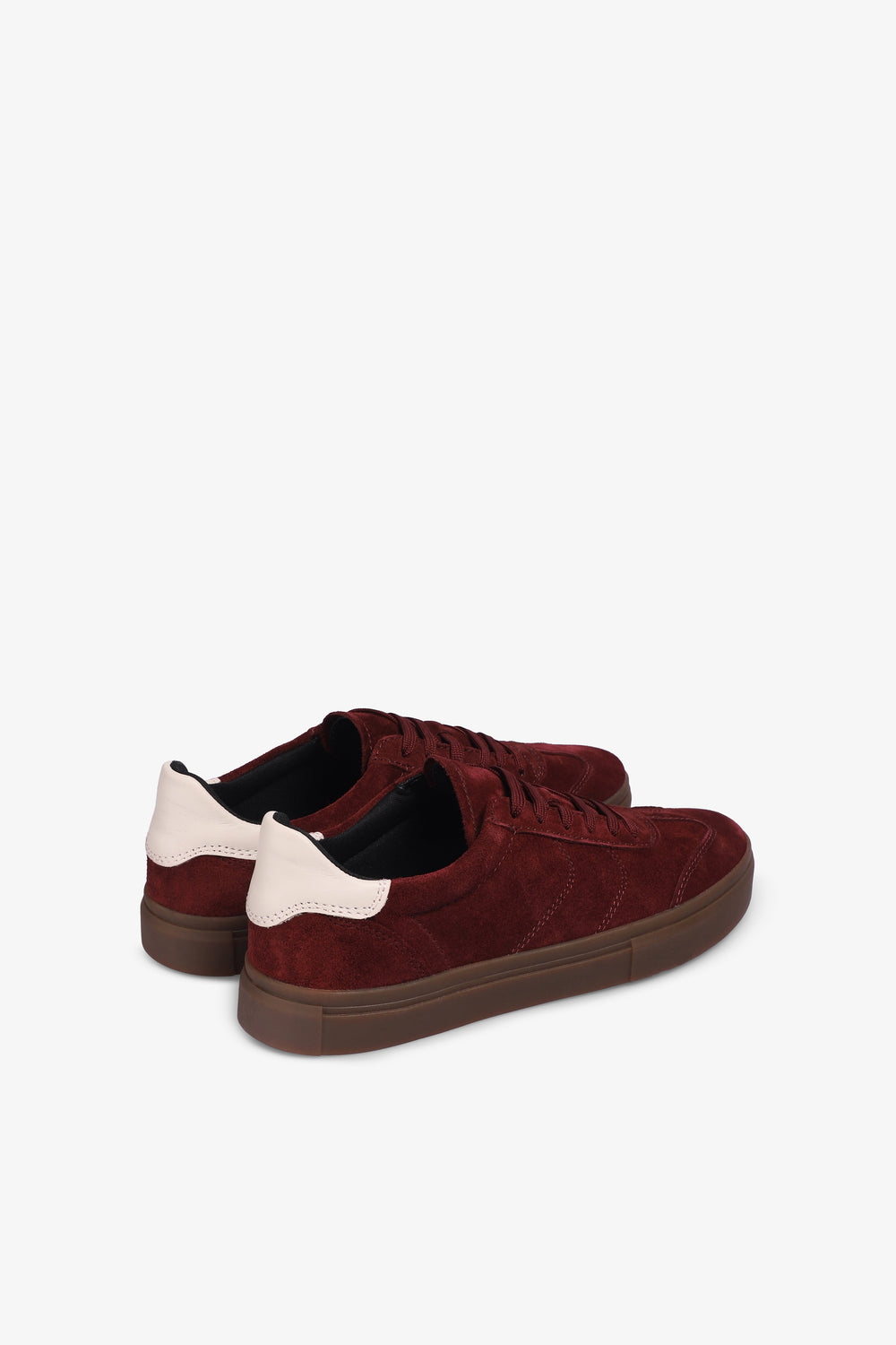 Sapatilhas Vagabond confecionadas em camurça vermelho-cereja, com um calcanhar em pele em contraste. Com fecho de cordões e palmilha de pele. Altura do tacão: 5 mm.