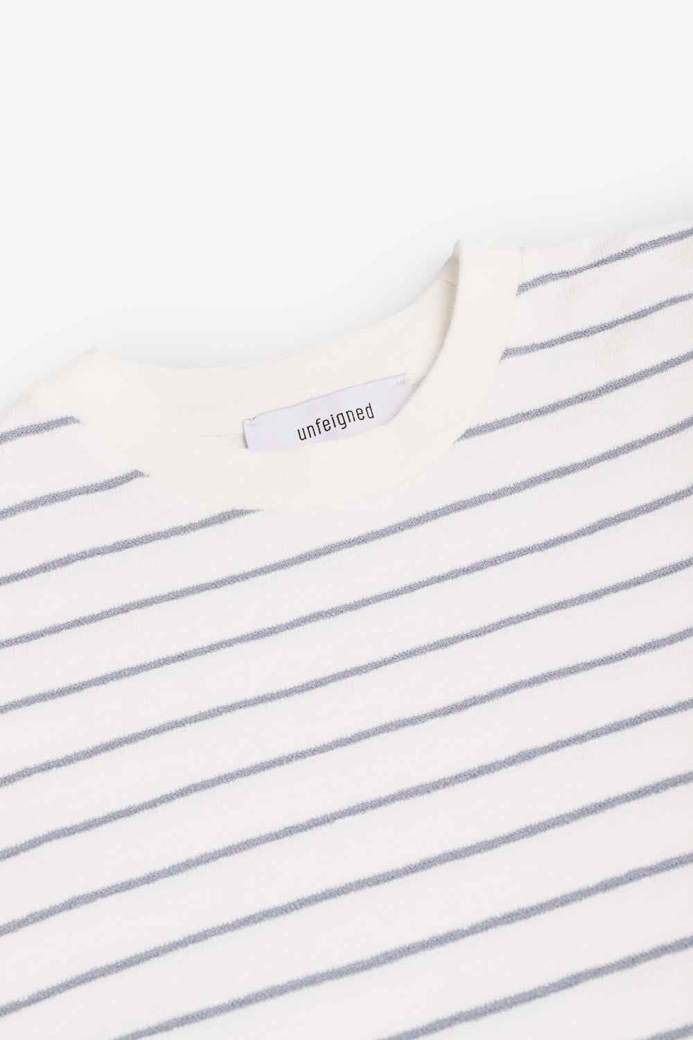 T-shirt Unfeigned confecionada em 85% algodão orgânico e 15% PA recycled. Design de manga comprida, aberturas laterais e riscas horizontais.