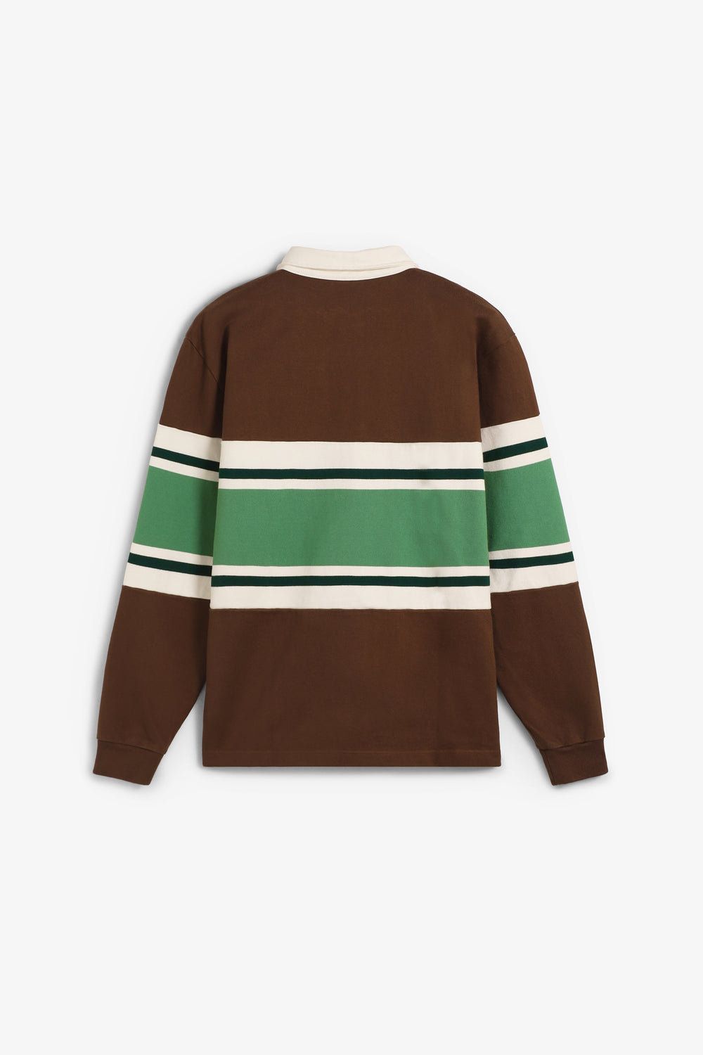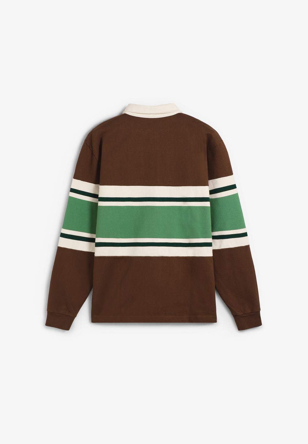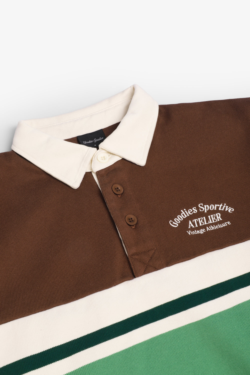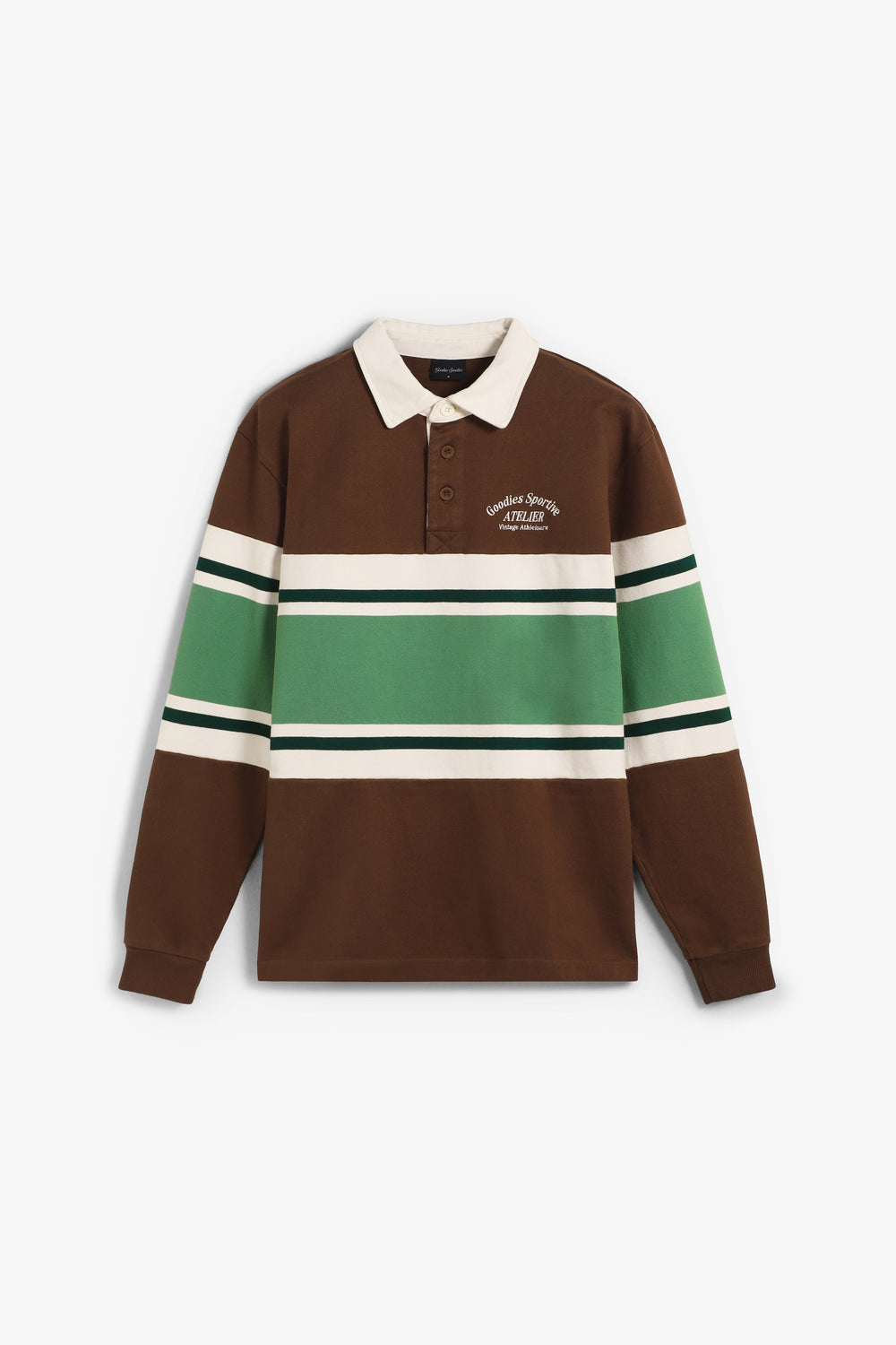 Camisa polo Goodies Sportive confecionada em 100% algodão. Com manga comprida, base de cor castanha com riscas verdes e bordado Goodies Sportive Atelier no peito.