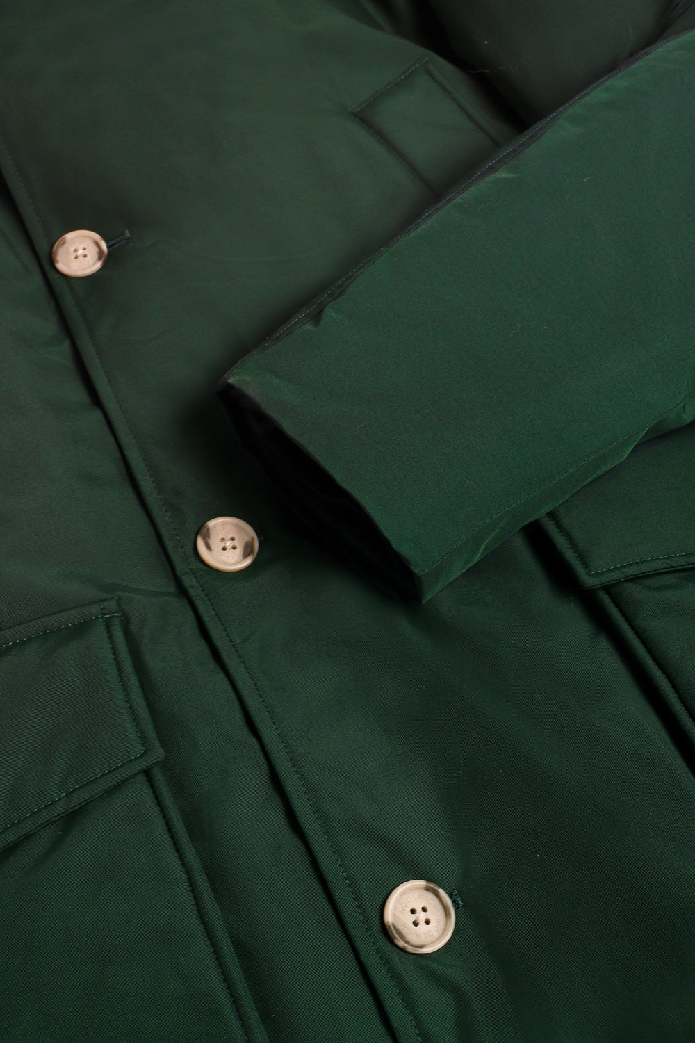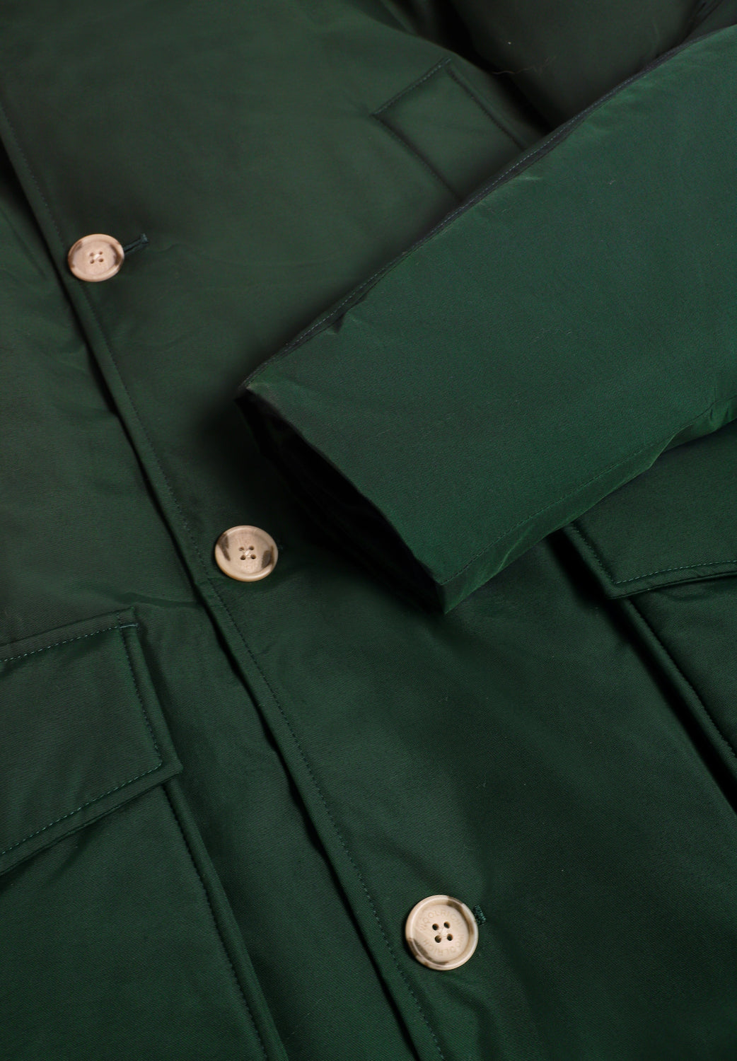 Casacos Woolrich confecionados em tecido Ramar Cloth, resistente à água e ao vento e enchimento de penugem de pato 80/20. Com capuz de proteção com inserção amovível de pelo de coiote, fecho de correr e botões, bolsos para aquecer as mãos, bolsos de remendo com aba e botões, bolsos internos e alça interna. Punhos interiores canelados.
