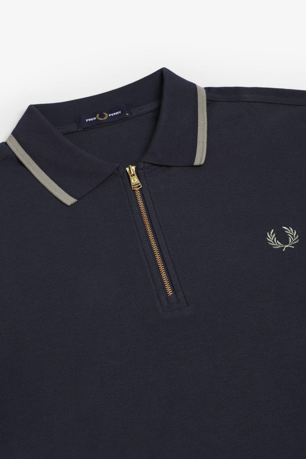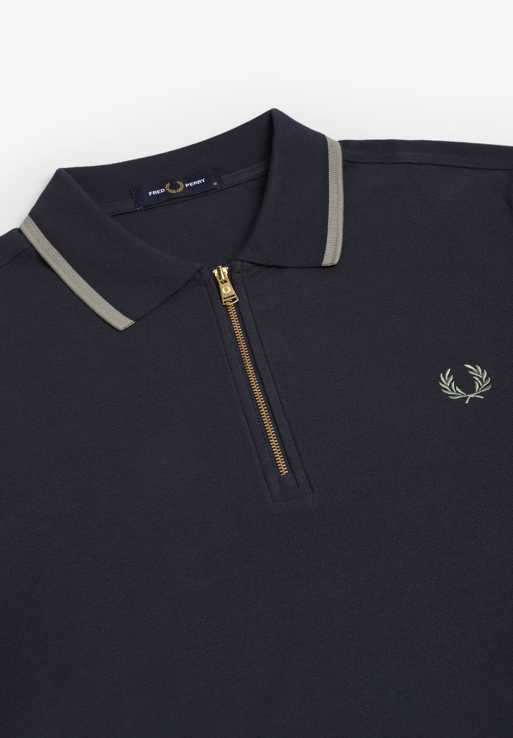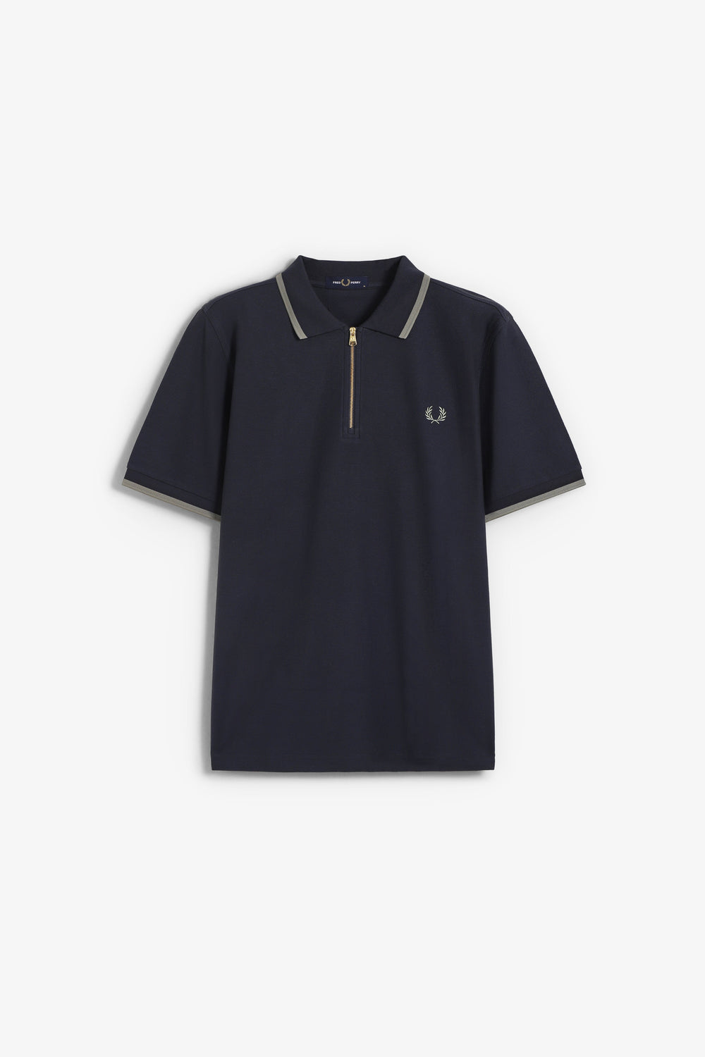 Camisa polo Fred Perry confecionado em crepe de piqué de algodão. Com um corte a direito, fecho de correr metálico com puxador com o logótipo da marca, gola e punhos canelados e logótipo da coroa de louros bordado no lado esquerdo do peito.