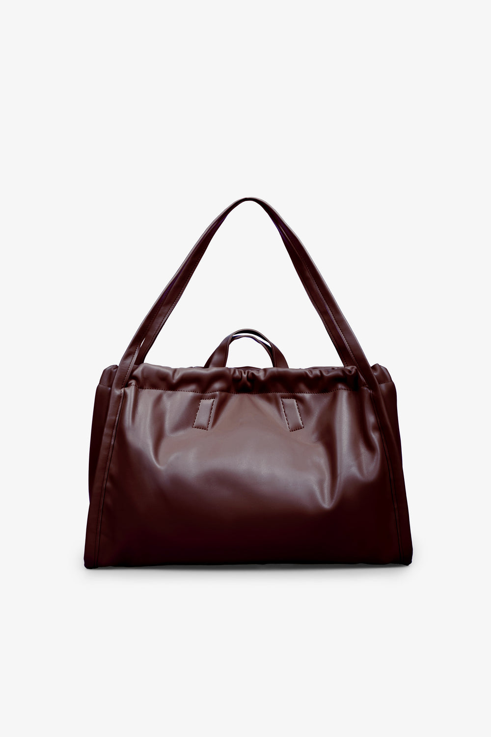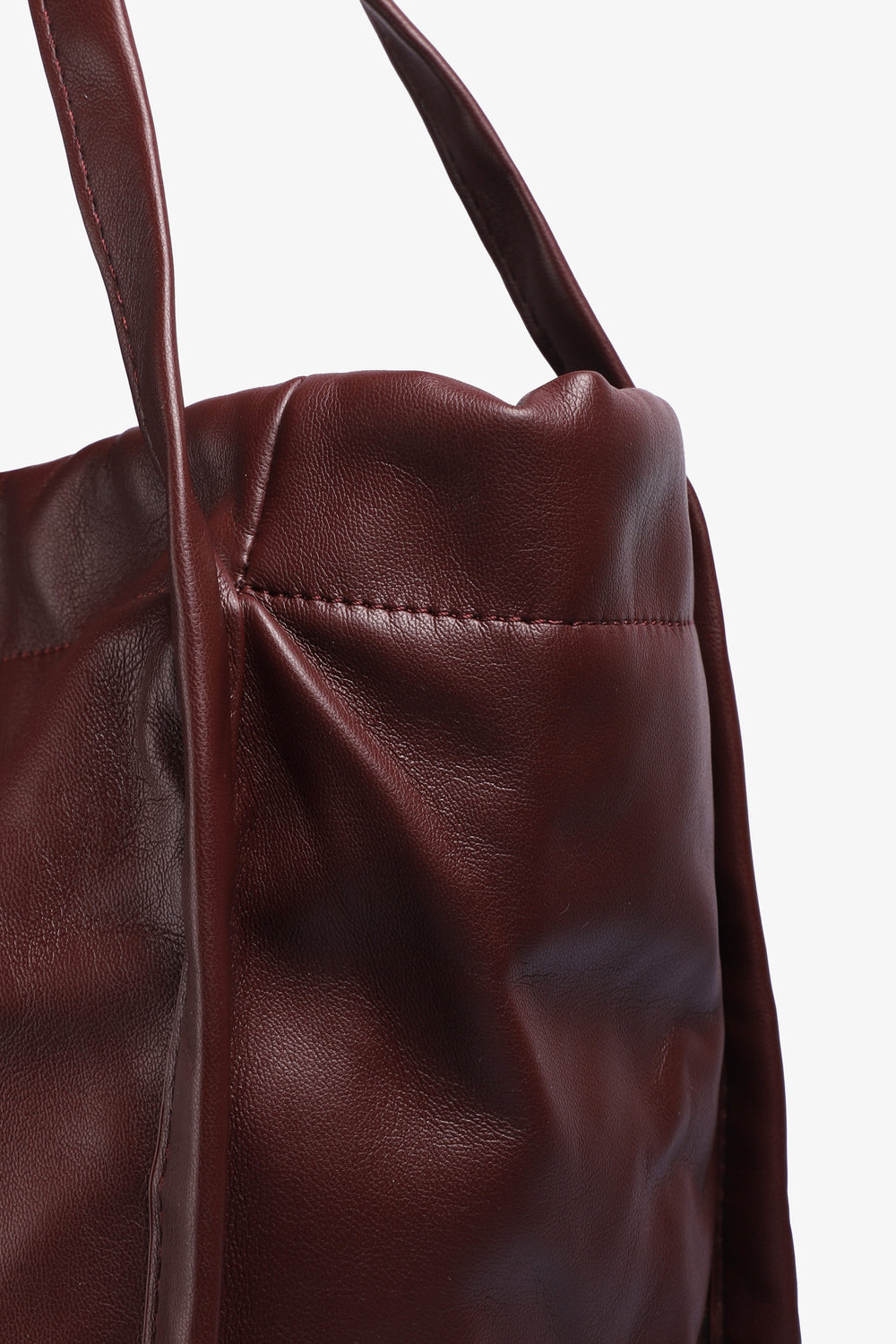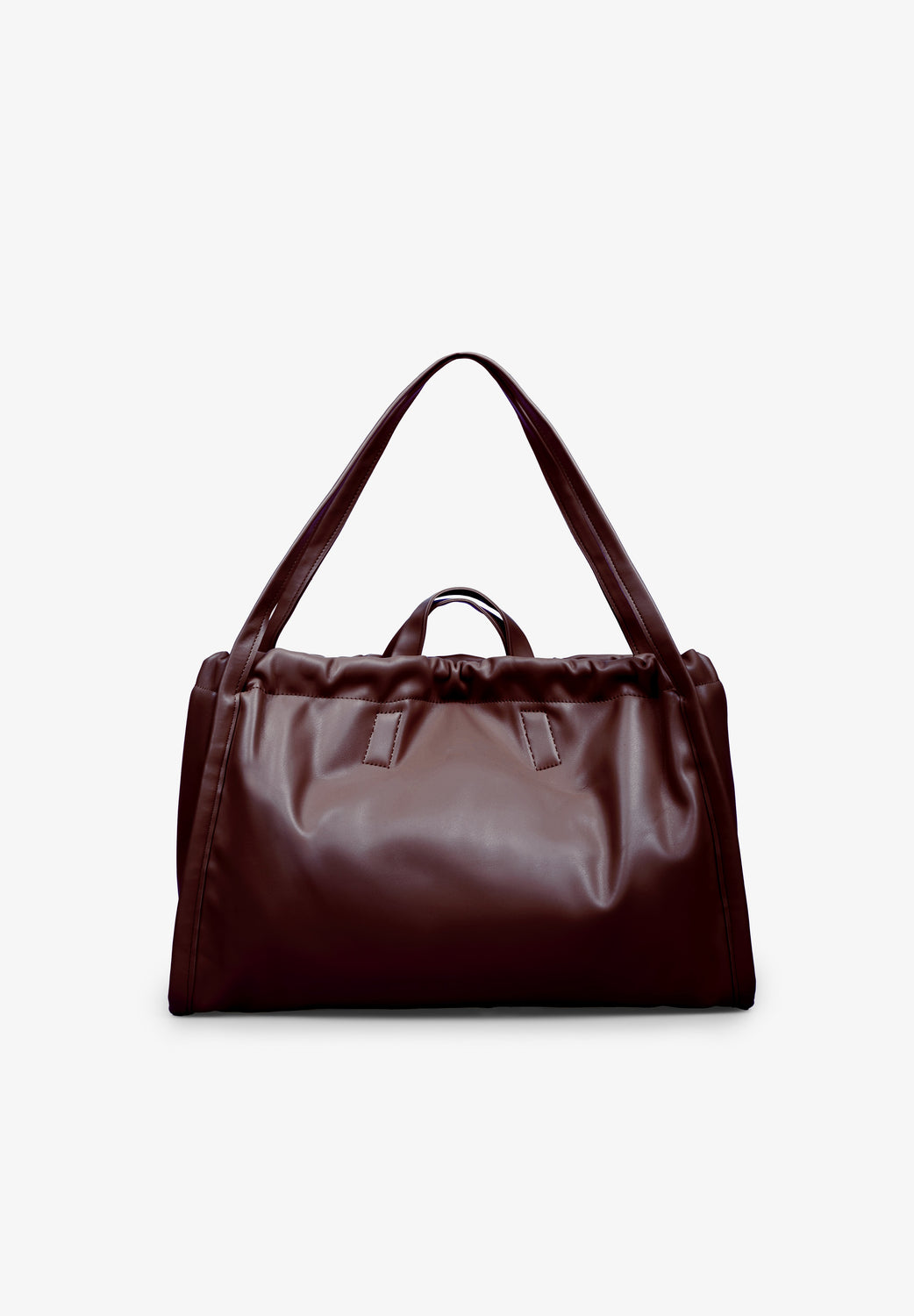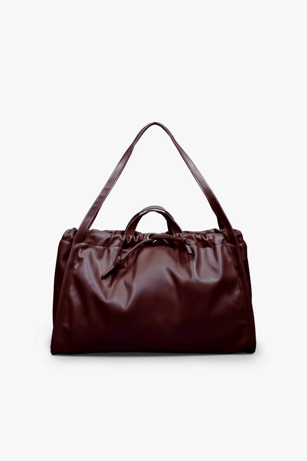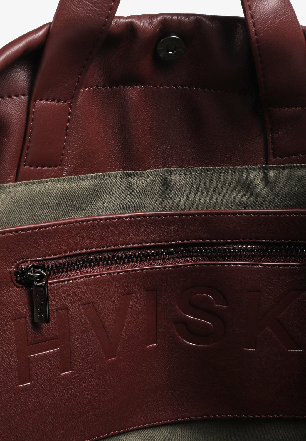 Bolsa Hvisk confecionada em mistura de materiais. 40% poliéster recycled, 18% poliuretano recycled, 18% poliuretano, 14% carbonato de cálcio, 10% madeira. Com alças curtas e largas, um compartimento principal, um bolso interior com fecho de correr e fecho de cordão e fecho magnético.