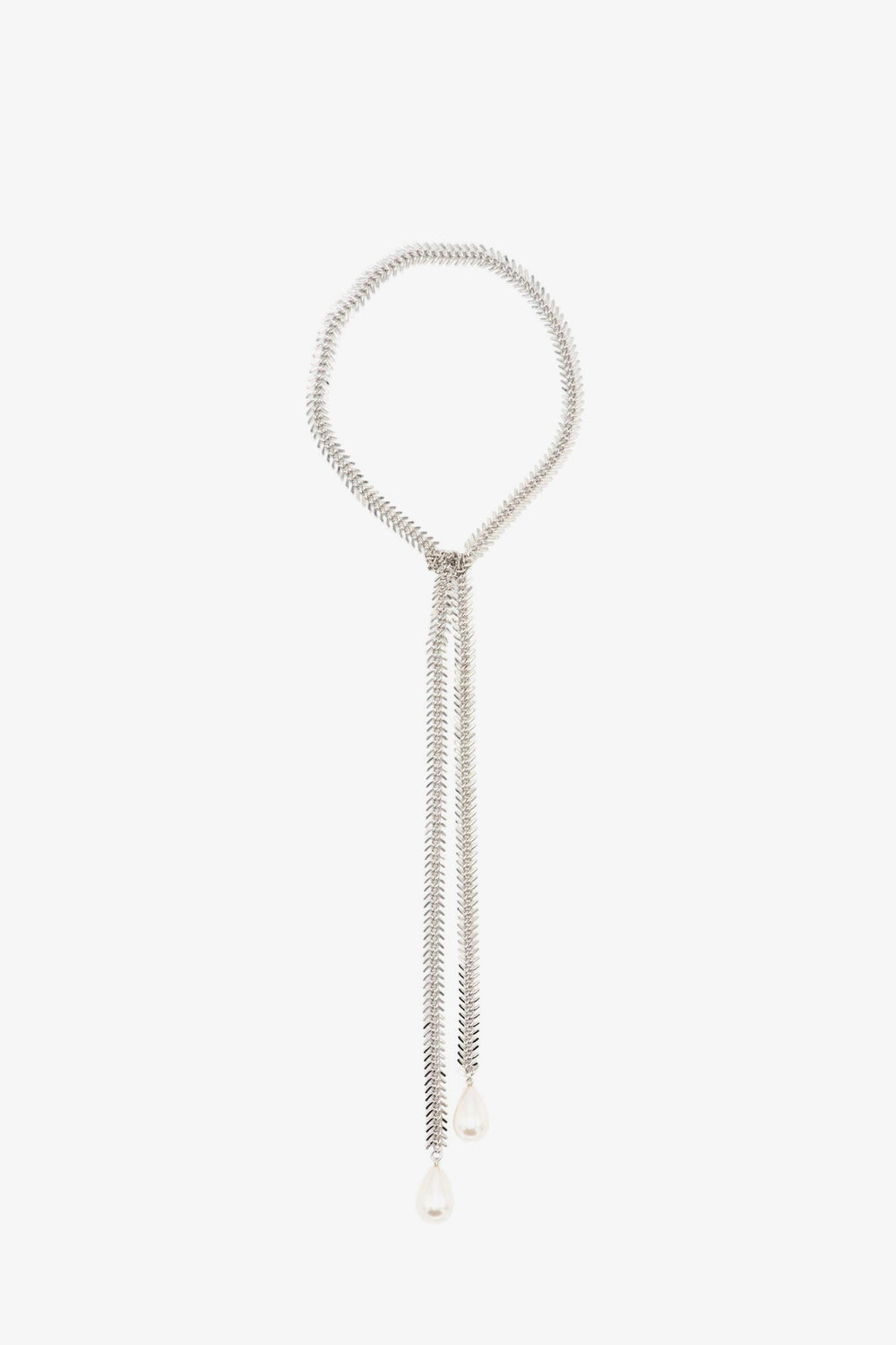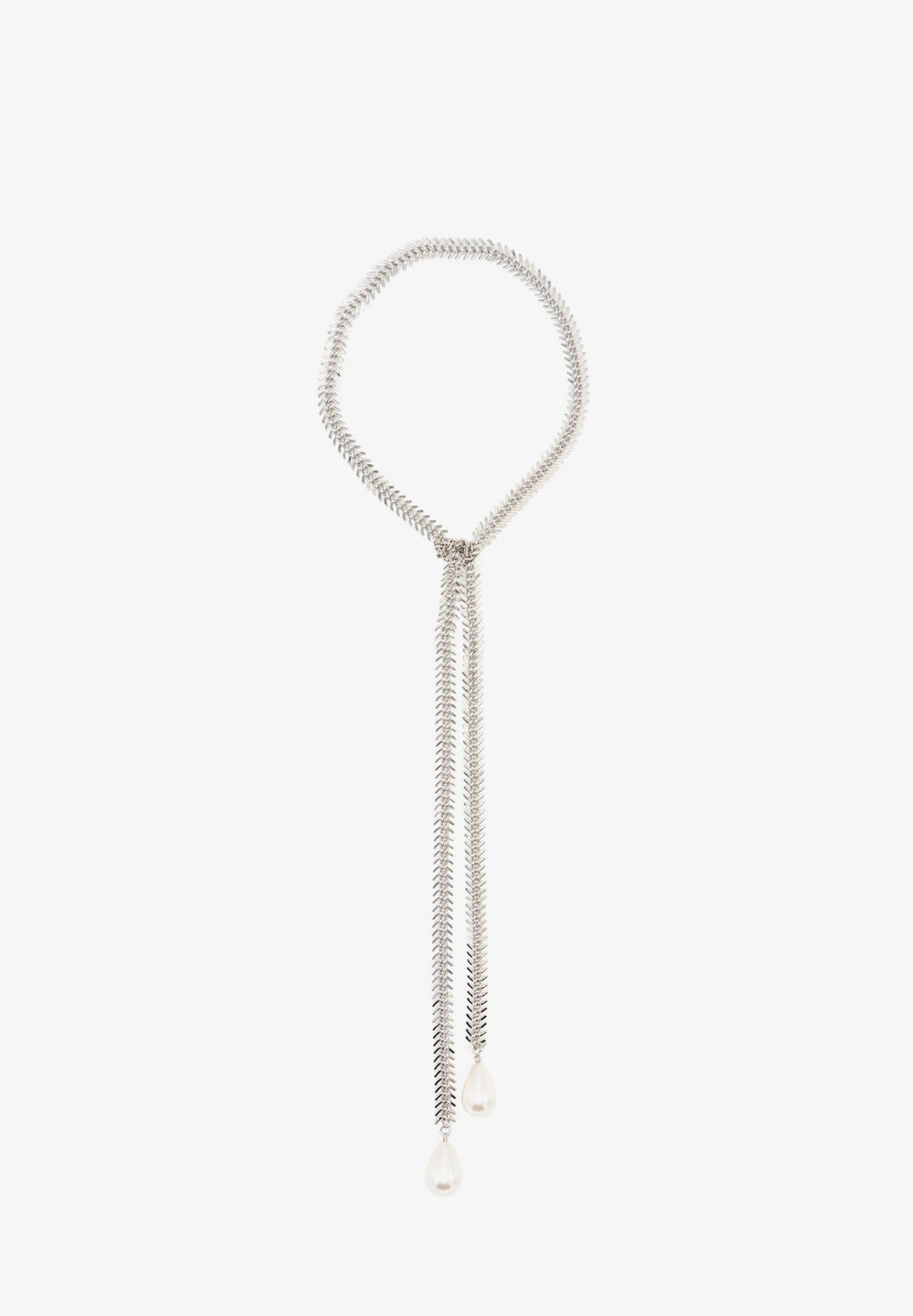Colar Sita Nevado extra comprido com efeito de gravata, feito com uma tira de corrente com forma de espiga e duas pérolas com núcleo de cristal nas extremidades. Pode ser usado com uma ou duas voltas e com um nó no centro.