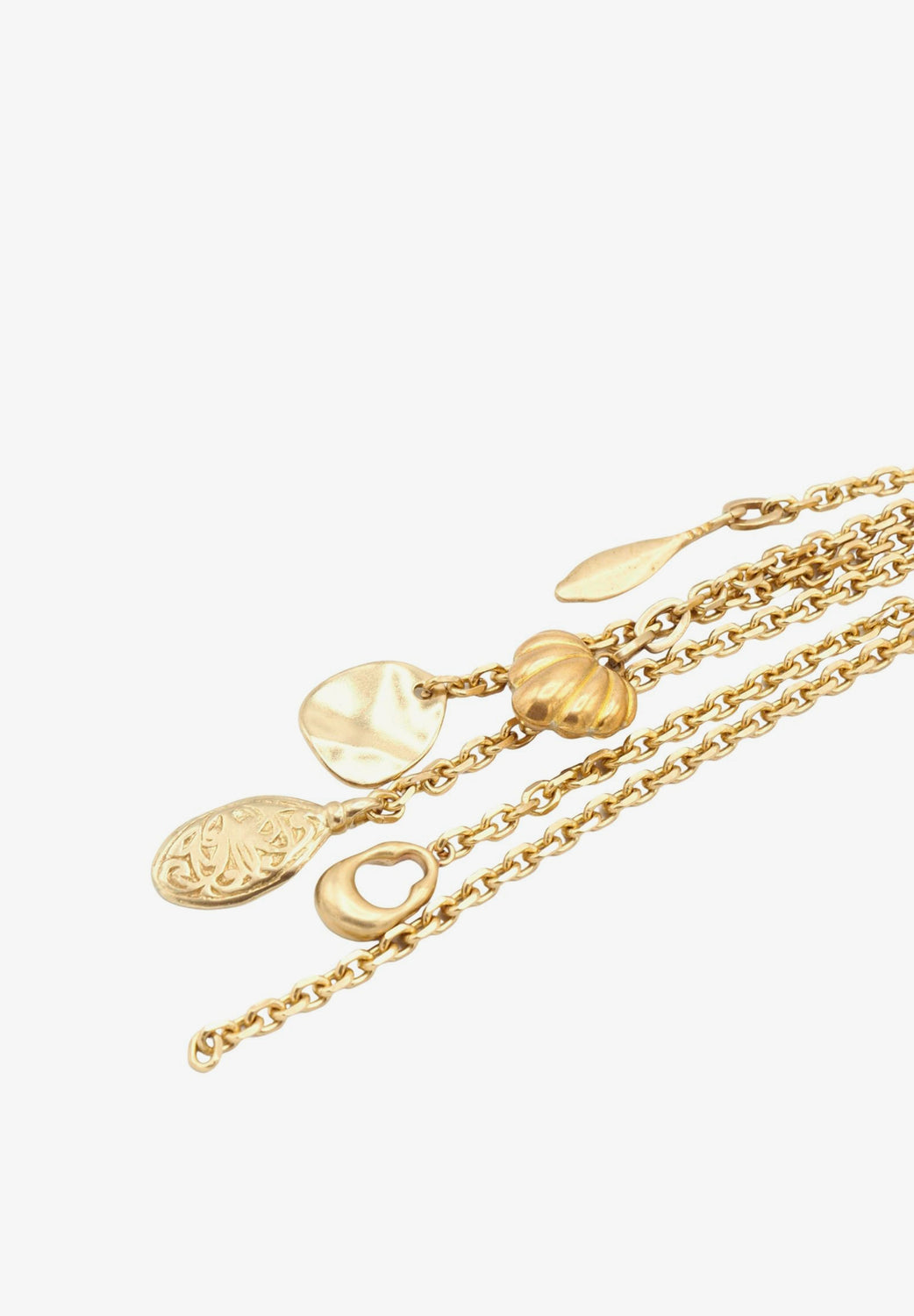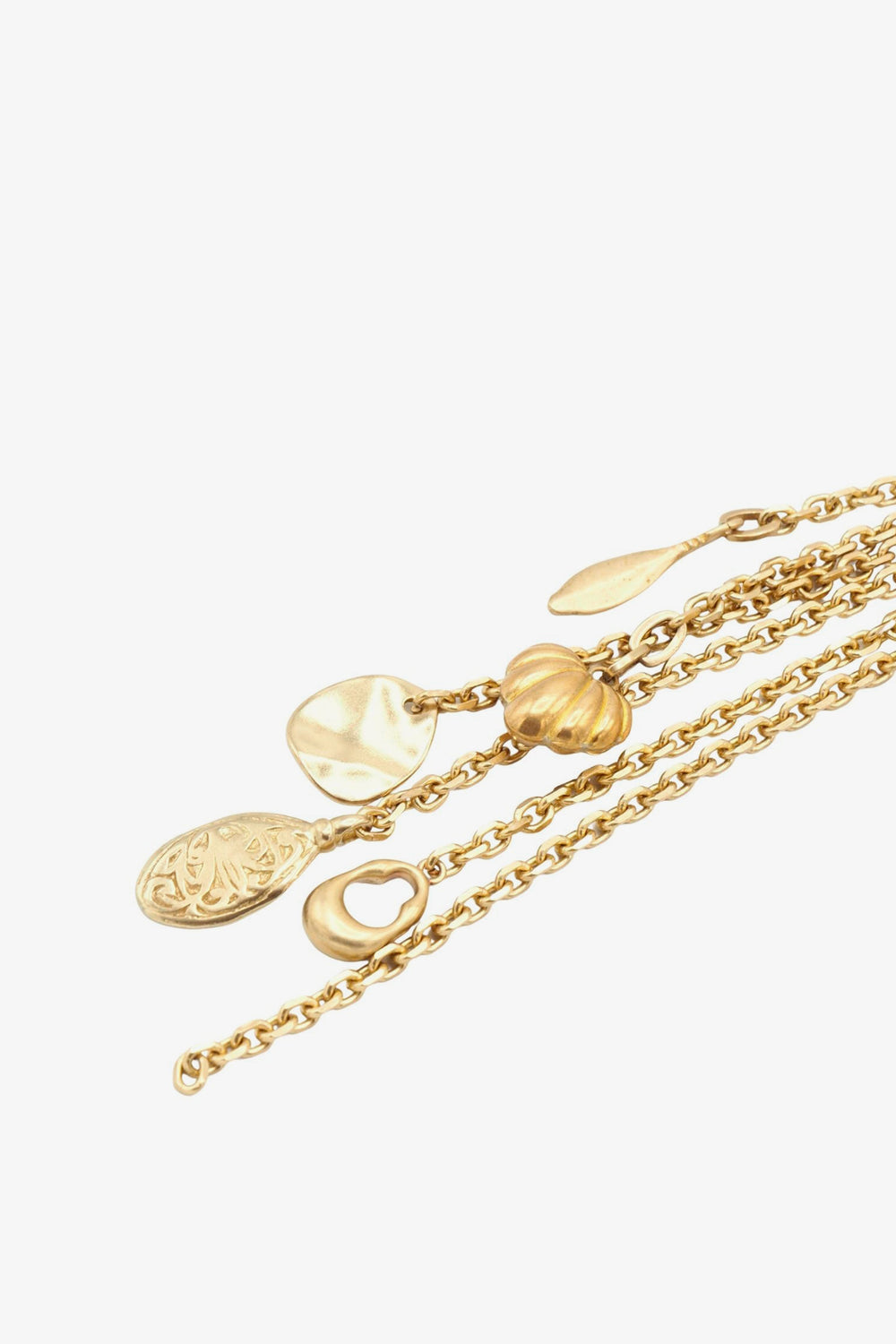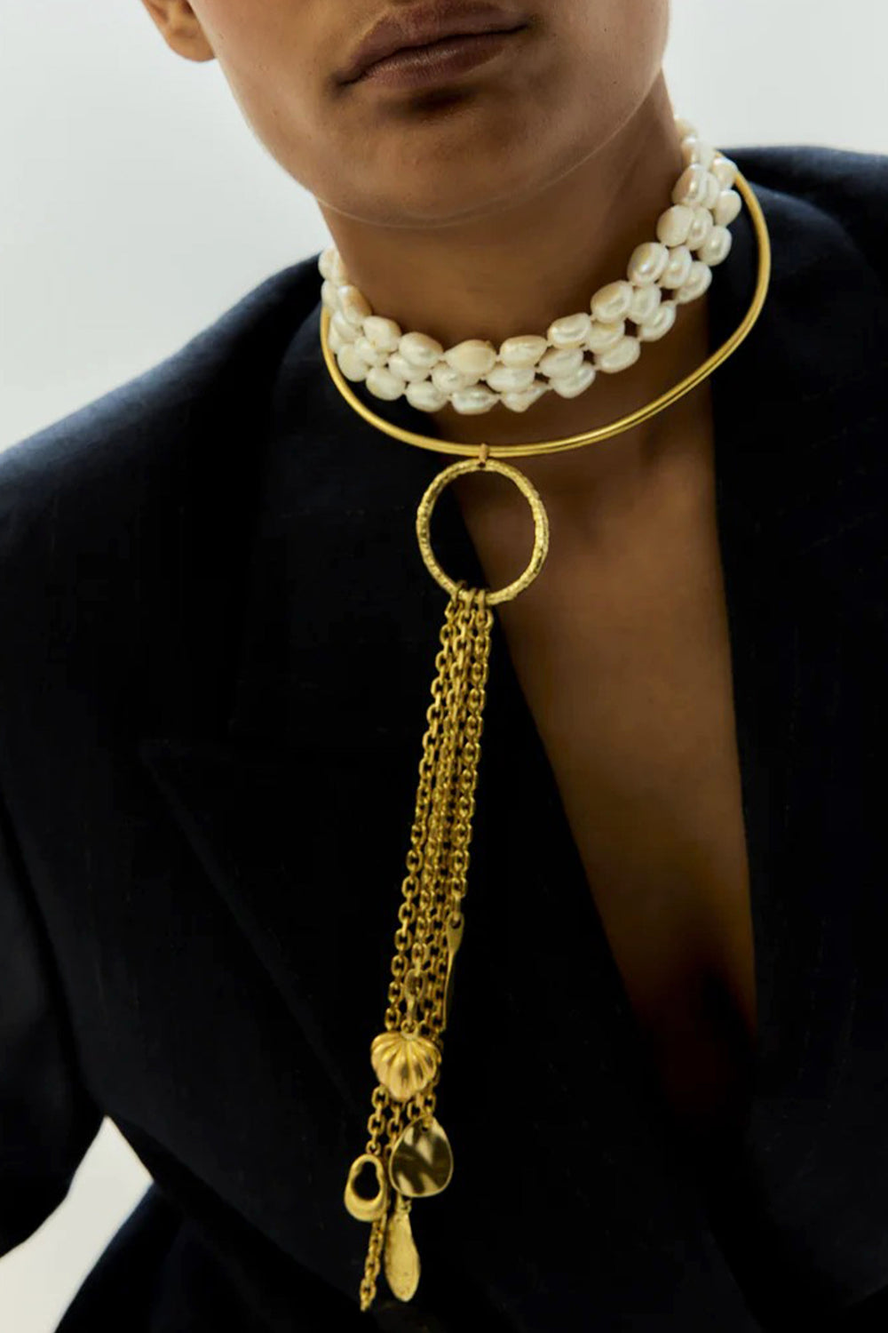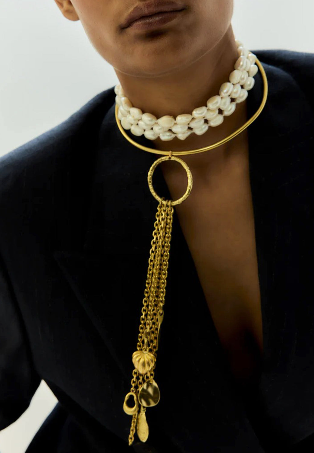 Colar Sita Nevado com efeito gravata, composto por um choker semi-rígido e pendentes em cascata com forma de moedas, emblemas e um coração.