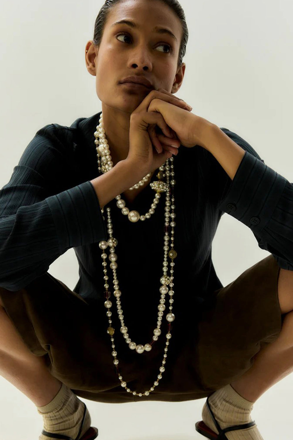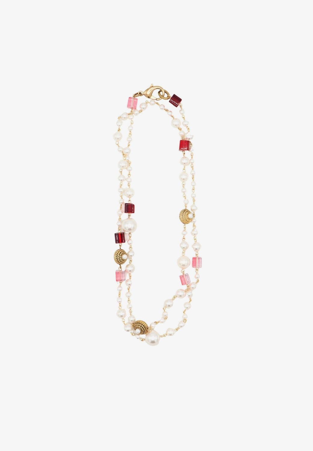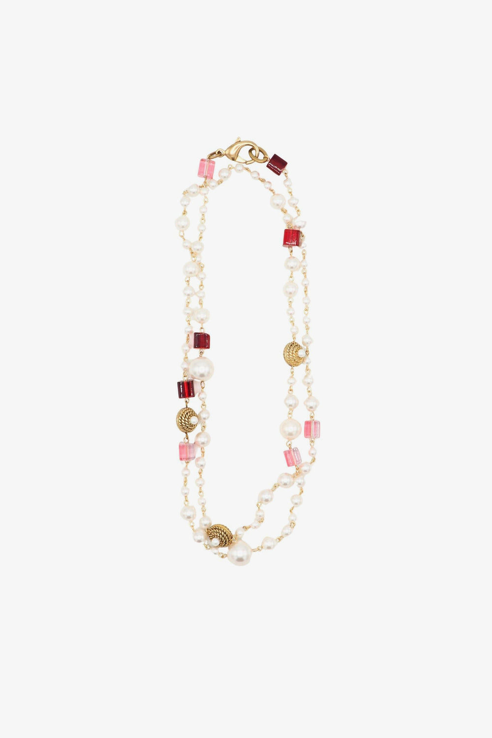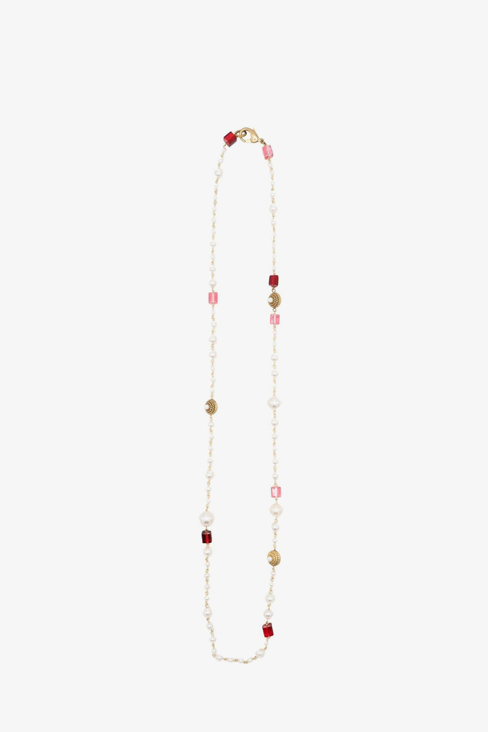 Colar Sita Nevado comprido, feito com bolas de pérola com núcleo de cristal e peças quadradas de cristal engastadas com fio de latão com proteção.