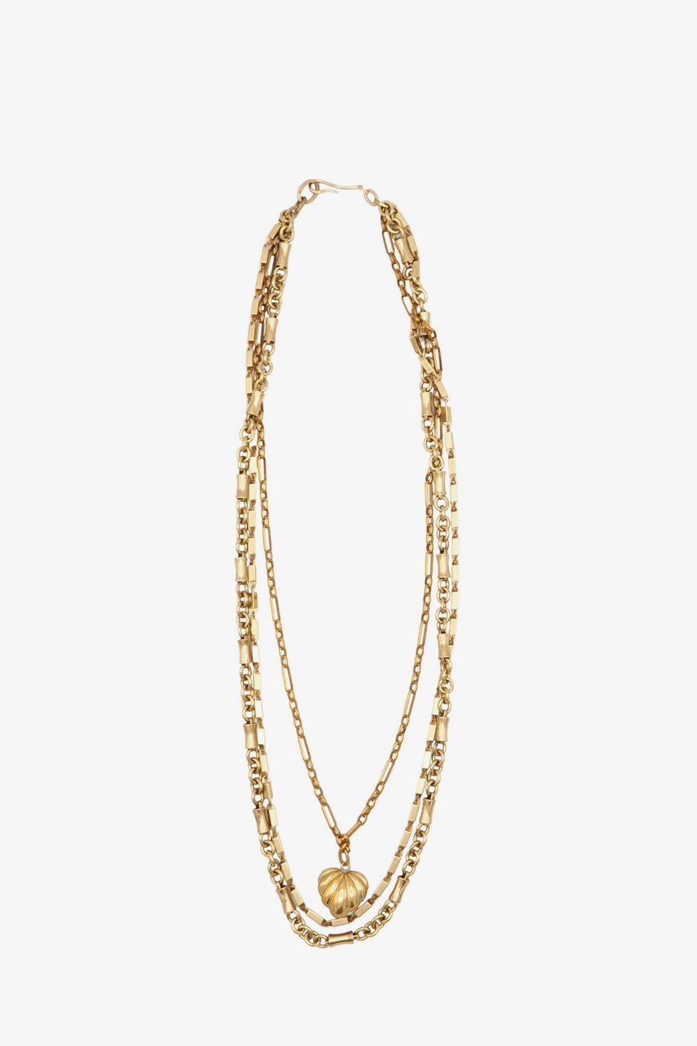 Colar Sita Nevado a meio peito, feito com três correntes diferentes a três alturas e um pendente com forma de coração.