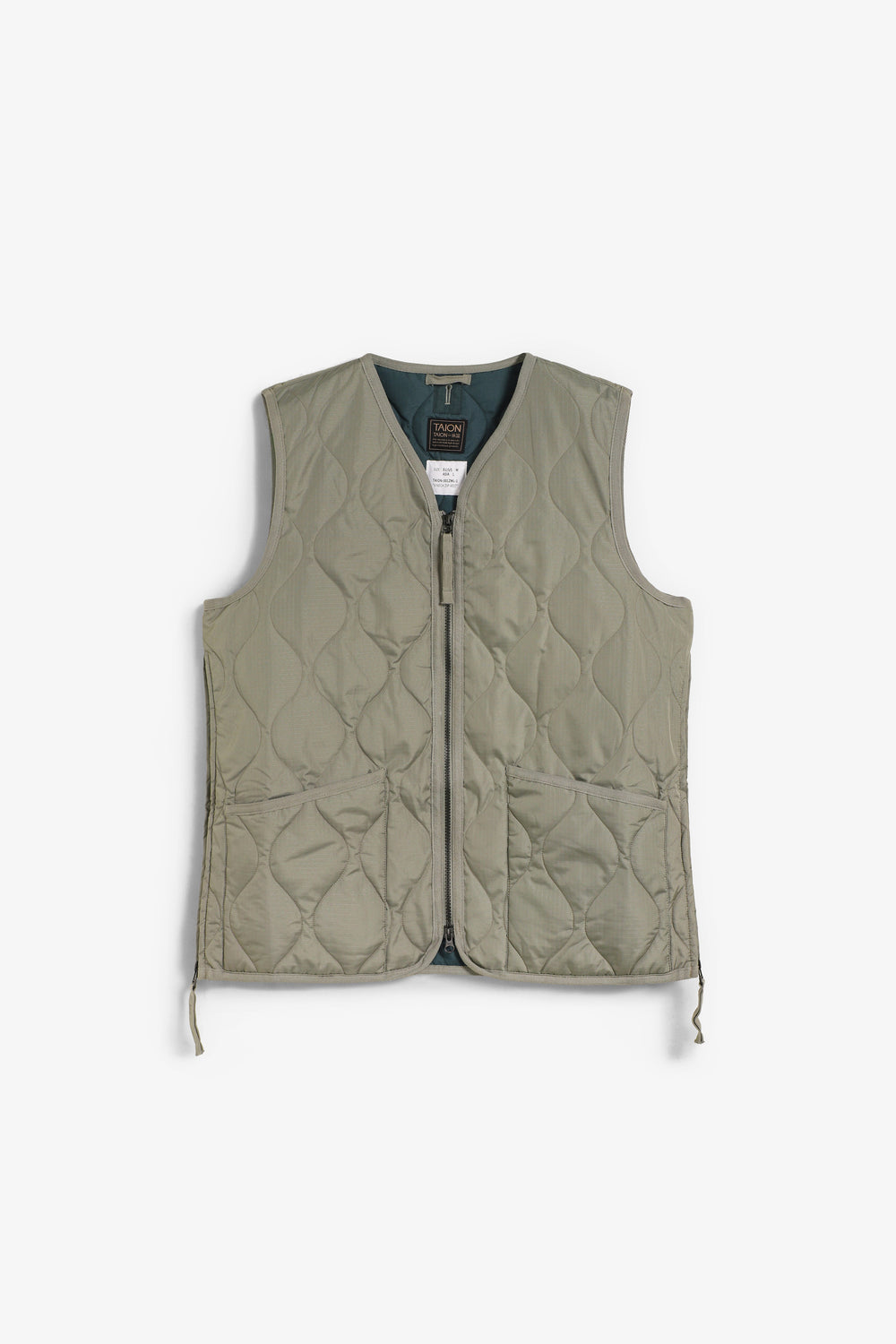 Colete Taion confecionado num tecido macio e leve com enchimento de penugem 800FP. Com um clássico acolchoado em ponto cebola que realça o seu estilo militar, um fecho de correr bidirecional e aberturas laterais que aumentam a liberdade de movimentos e facilitam o acesso fácil aos bolsos das calças.